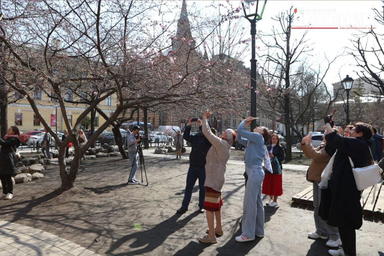 Местные жители уже начали посещать Сад Дружбы, расположенный на Литейном проспекте, чтобы полюбоваться цветущей сакурой и запечатлеть ее на фотографиях.