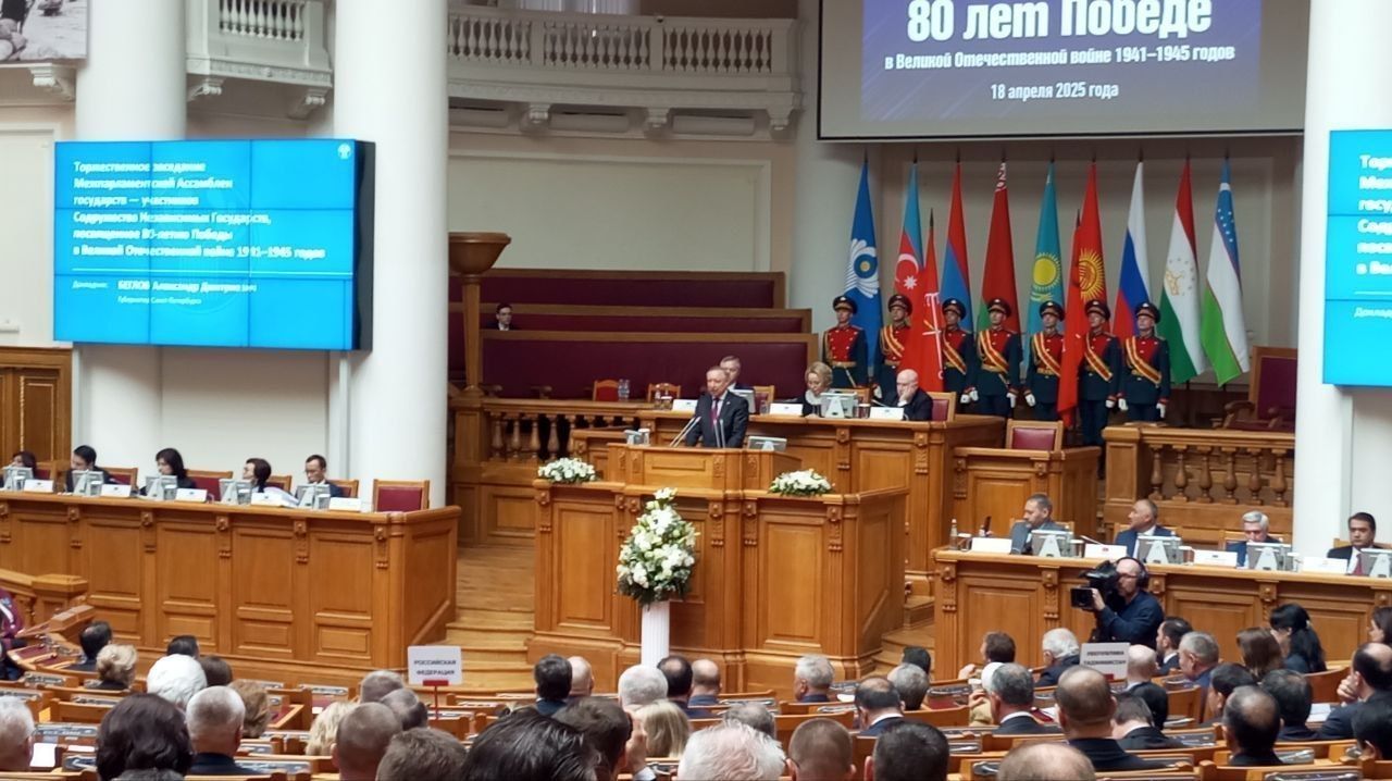 Среди флагов в Таврическом дворце на заседании Межпарламентской Ассамблеи СНГ сегодня не только стяги республик, но и флаг Петербурга как города, принимающего мероприятие, и Знамя Победы – заседание торжественное, посвящено 80-летию Победы.