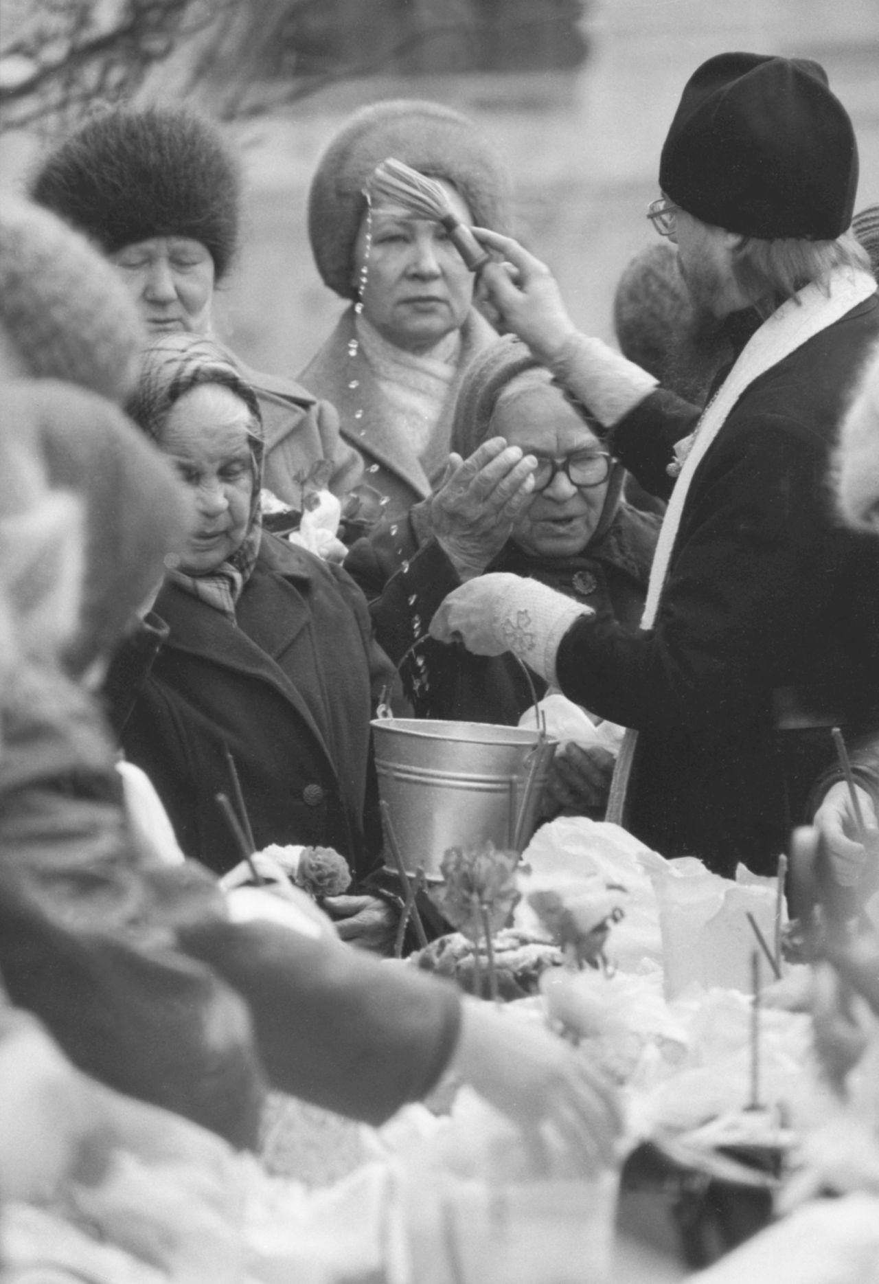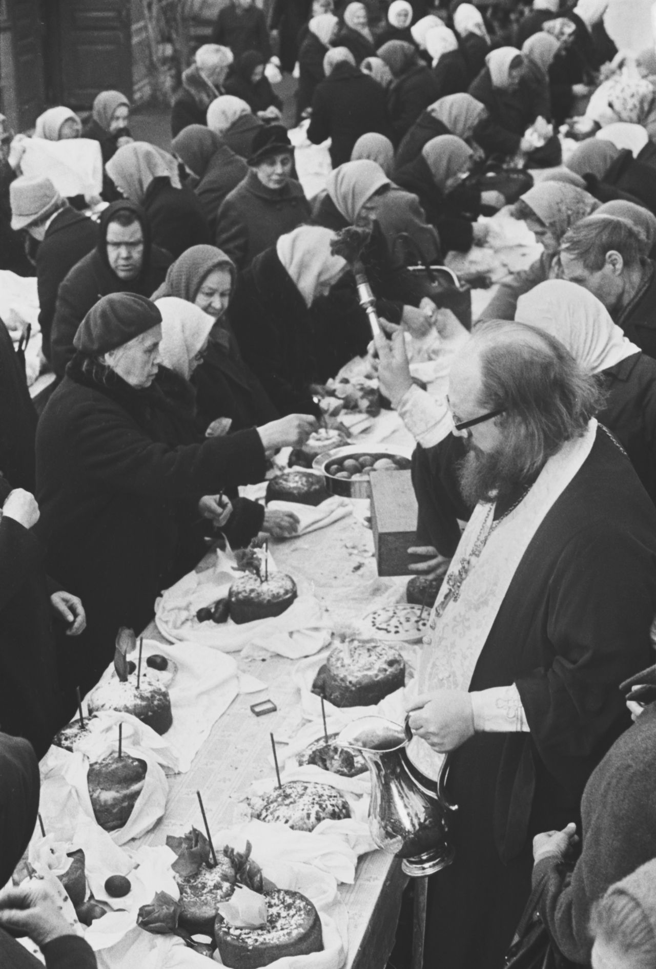 «Священник освящал куличи. Это было трогательно. Шли женщины с ломтиками чёрного хлеба и свечами, батюшка кропил их святой водой...» – цитирует Владимир Дервенев воспоминания блокадницы Любови Шапориной о первой военной Пасхе.