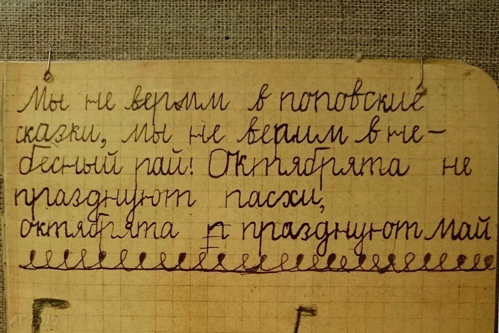 «Все научные достижения подавались как победа над Церковью и «необразованными попами». Во время религиозных праздников около действующих церквей и храмов дежурили комсомольские патрули, отговаривающие прихожан от участия в религиозных обрядах и не пускавшие их в храм. Иногда они применяли силовые методы», – рассказал Алексей Гайдуков.