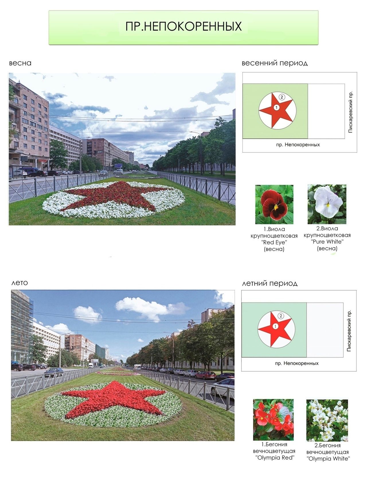 Рядом с площадью Мужества, на проспекте Непокоренных, планируется расположить цветник в форме звезды, который весной украсят виола крупноцветковая красного и белого оттенка, а летом – красная и белая бегония вечноцветущая.