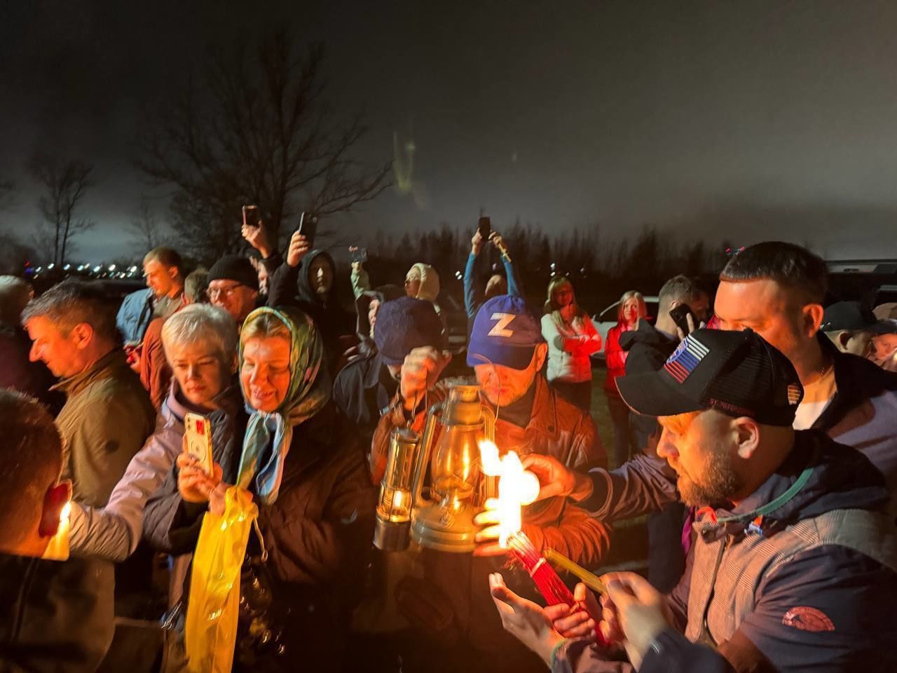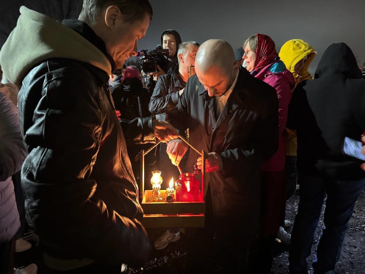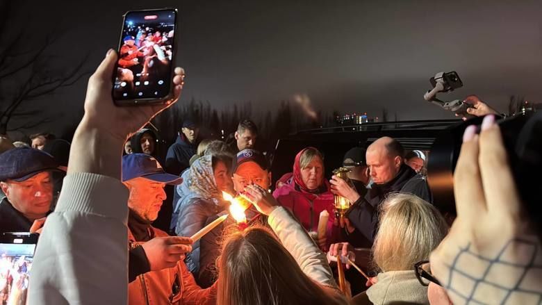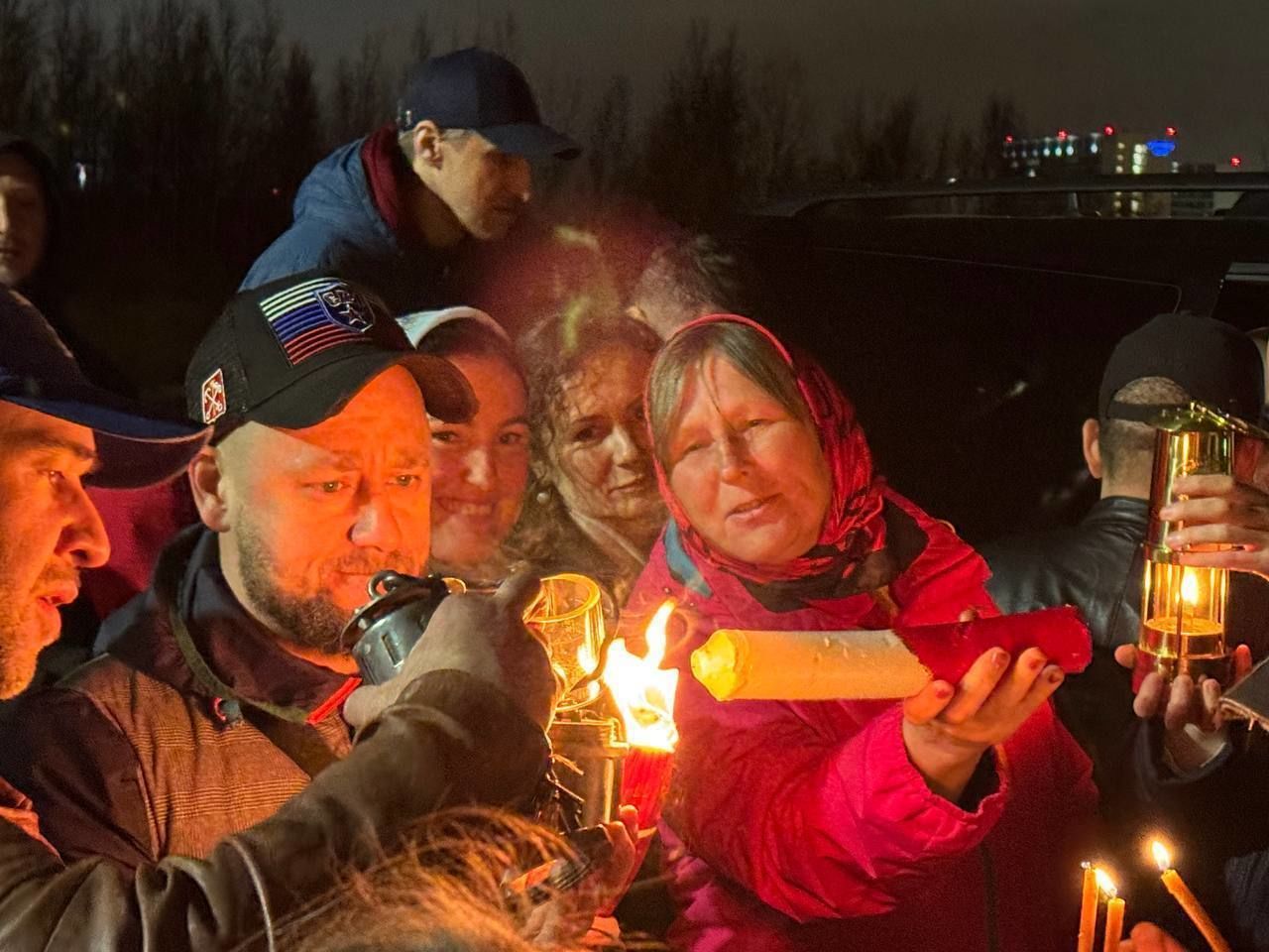 Более ста человек собрались у аэропорта Пулково, чтобы зажечь от него свои свечи и лампады и увезти домой частицу великого чуда.