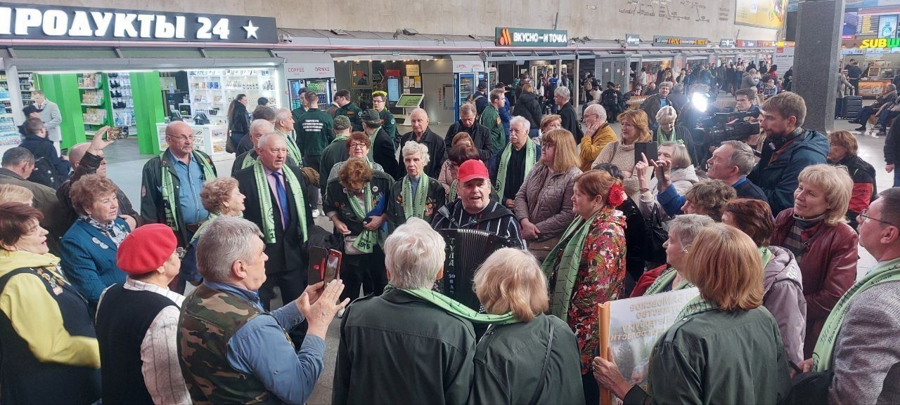 Большинство участников памятной акции – бойцы четырех линейных отрядов, которые были в составе первого сводного эшелона «Комсомолец Ленинграда». Они начали собираться в главном зале Московского вокзала в два часа дня – красивые пожилые люди в зеленых шарфах и со знаменами своих стройотрядов. Один из участников встречи приехал к старым друзьям с аккордеоном, на котором виртуозно играл. В итоге удивленные пассажиры Московского вокзала услышали хоровое исполнение песен «Мой адрес – Советский Союз», «Надежда» и множества других.