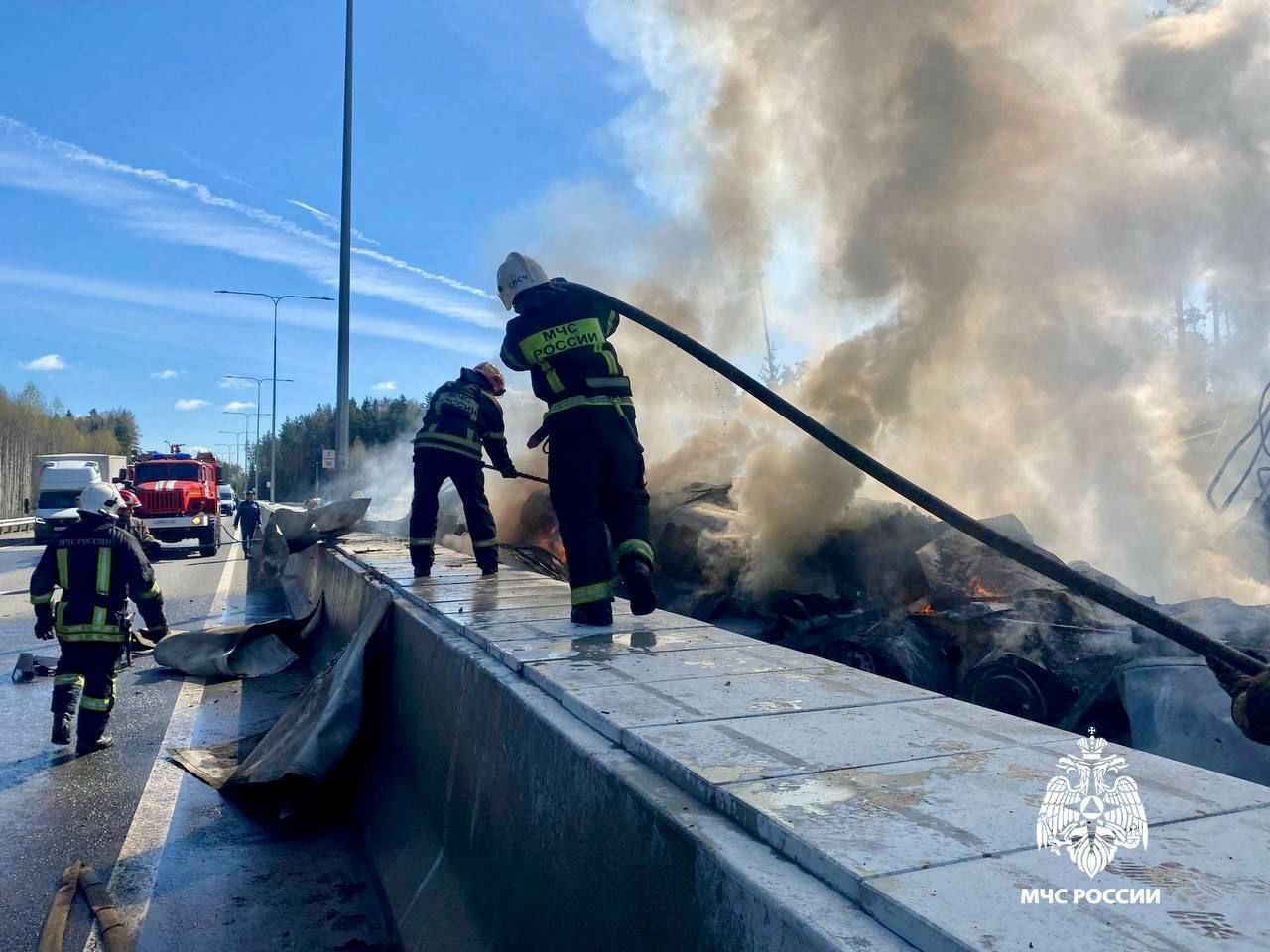 ГУМЧС по Тверской области информировало, что два грузовика и легковой автомобиль столкнулись на М-11, после чего произошел пожар. Предварительно, два человека получили травмы. Пожар был локализован.