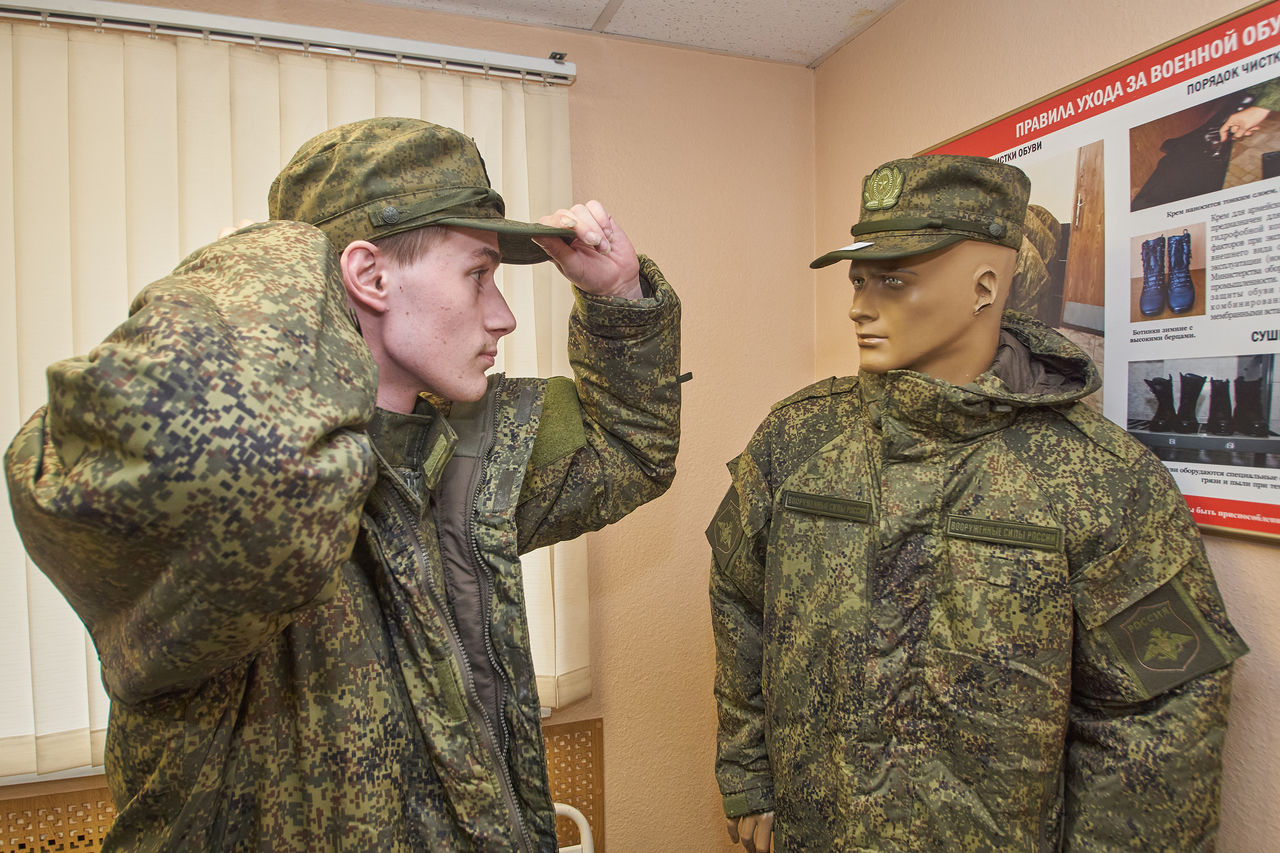 Тем временем ребята проходят заключительный медосмотр у специалистов, дактилоскопическую регистрацию, распределяются по командам после чего отправляются переодеваться. Всё в соответствии с требованиями начальника тыла Минобороны – комплект формы, соответствующий по цвету родам войск. Зелёная – сухопутные, синяя – ВКС, чёрная – флот. Сумки, несессеры с личными вещами и многое другое. Первая «примерка» затягивается – парням приходится разбираться, что и как. К тому же пока новобранцы ещё не очень уютно чувствуют себя в новенькой, необмятой форме.