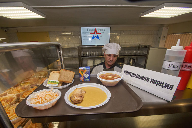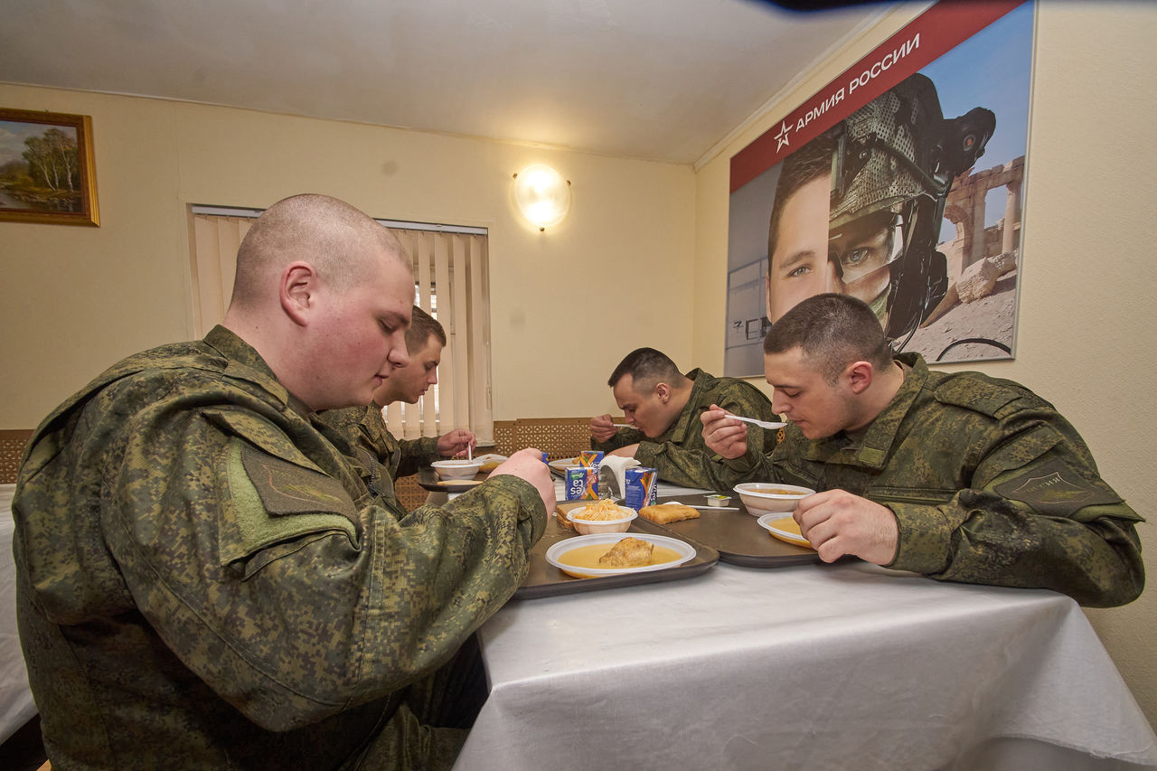 Призыв призывом, а обед по расписанию. Первое, второе, салат и сок. Честно говоря, смотря на содержимое тарелок ребят и сравнивая его с тем, что приходилось хлебать в армейской столовой в советские годы, немного нынешним призывникам завидуешь.