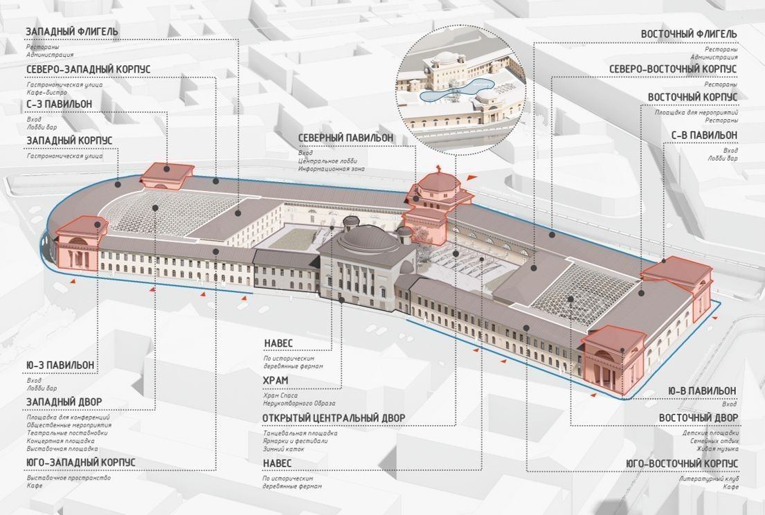 Комплекс станет многофункциональным центром, в котором оборудуют площадки для детского и семейного досуга, расположат выставочные пространства, литературный клуб, концертные площадки и другие локации, а зимой в центральном дворе будет организован каток.