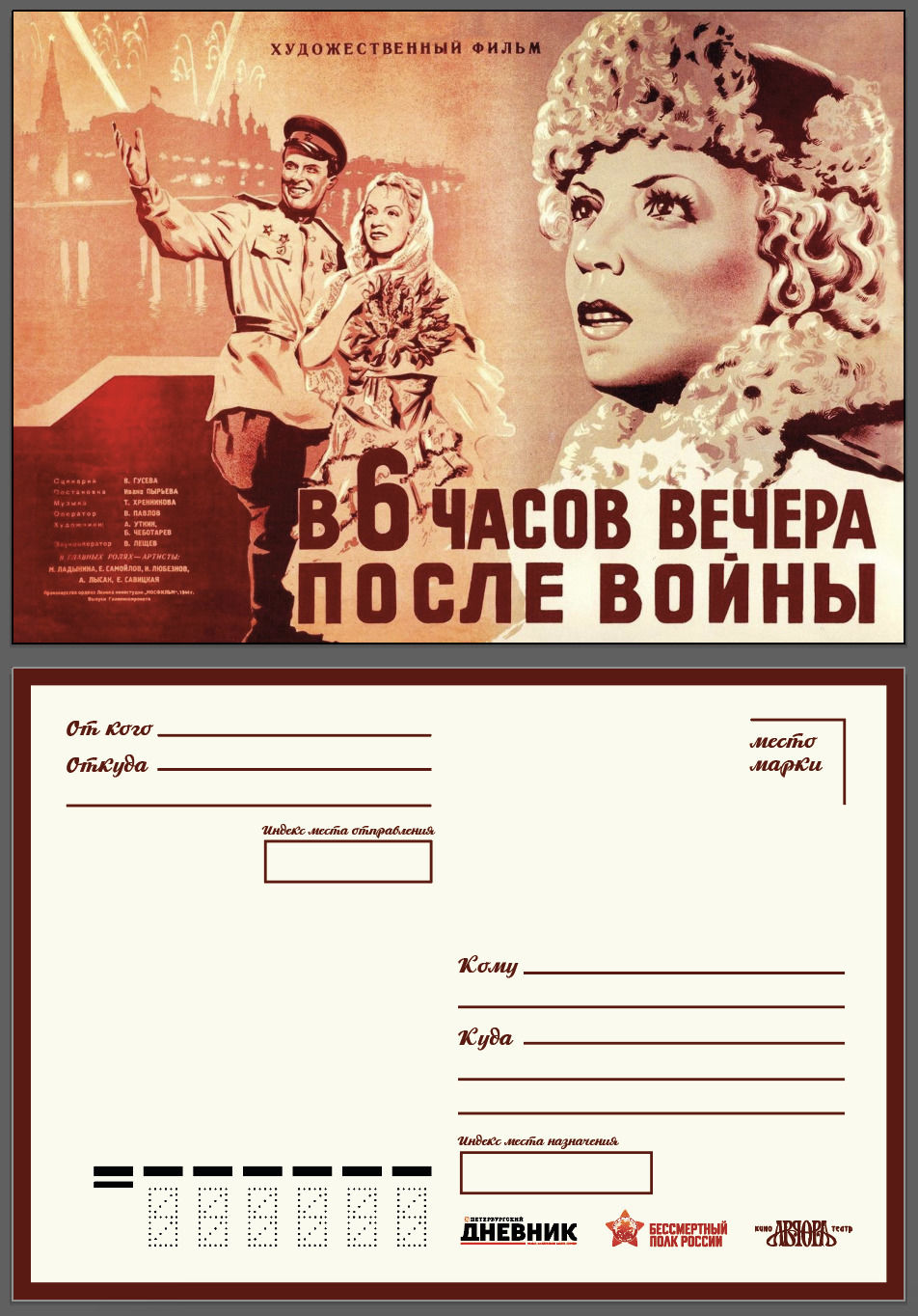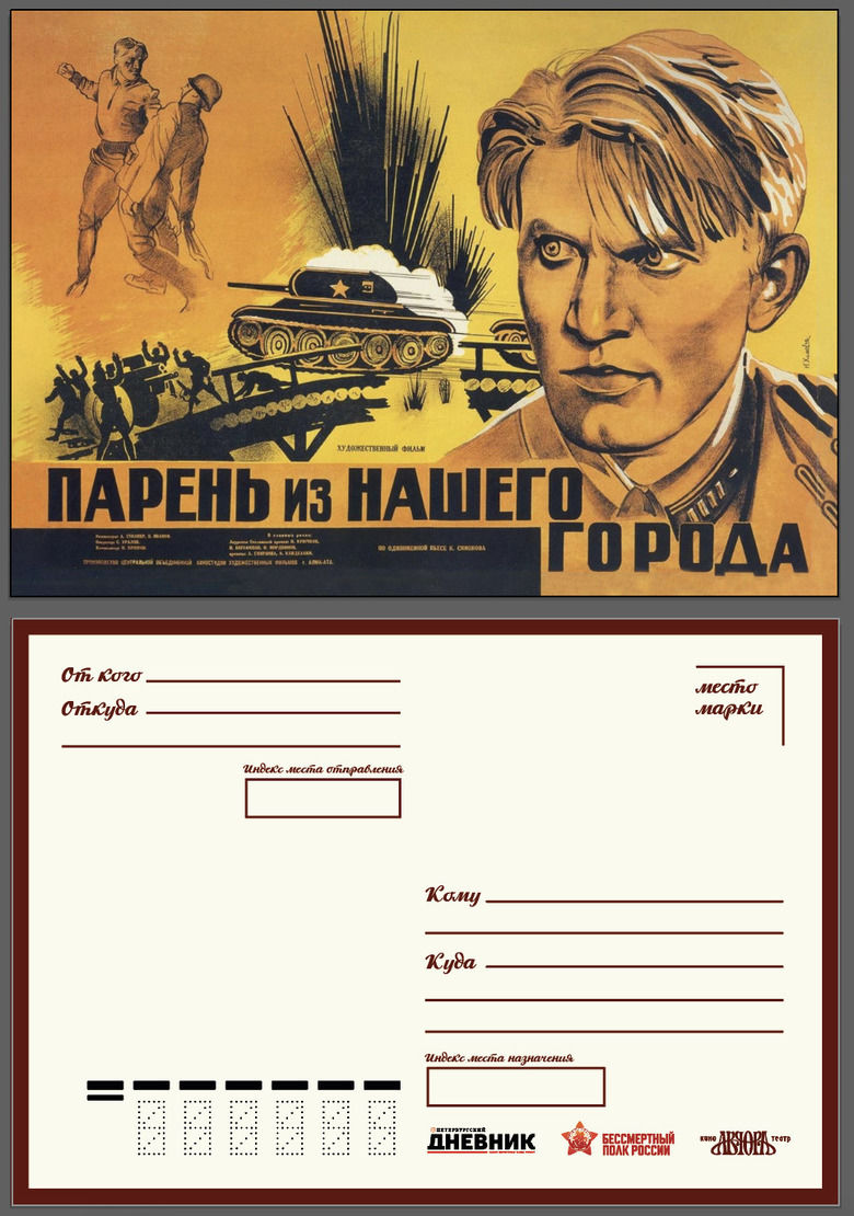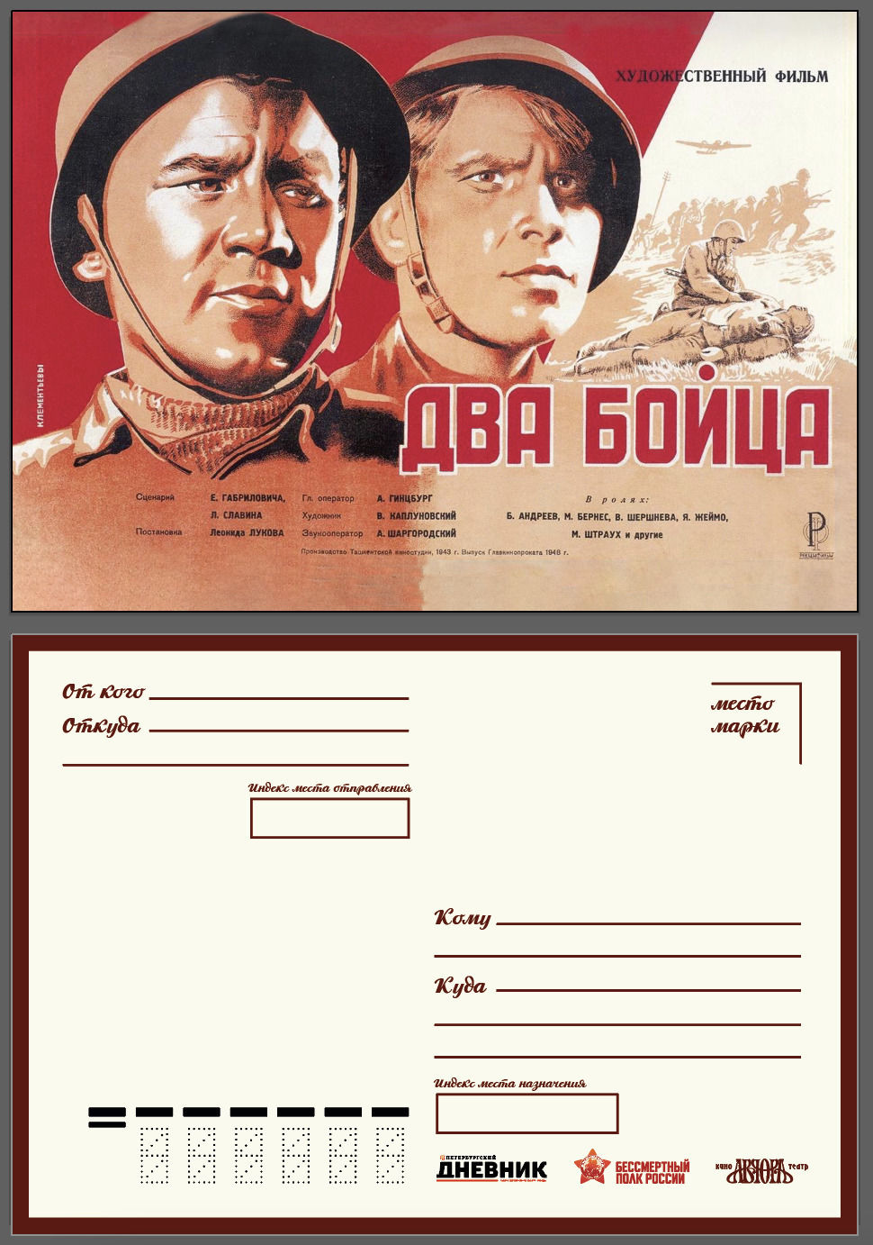 «На наших открытках изображены афиши легендарных военных фильмов, таких как «Два бойца», «В 6 часов вечера после войны» и «Парень из нашего города», – отметил руководитель штаба петербургского отделения «Бессмертного полка России» в Санкт-Петербурге, главный редактор «Петербургского дневника» Кирилл Смирнов.