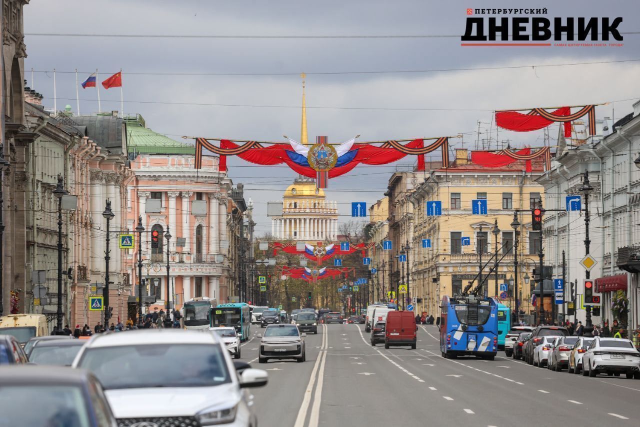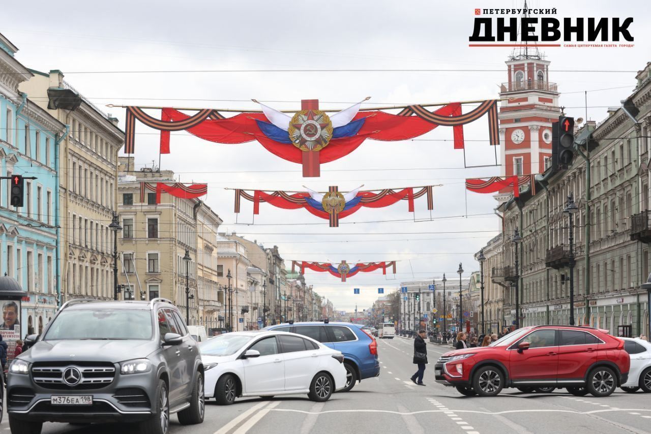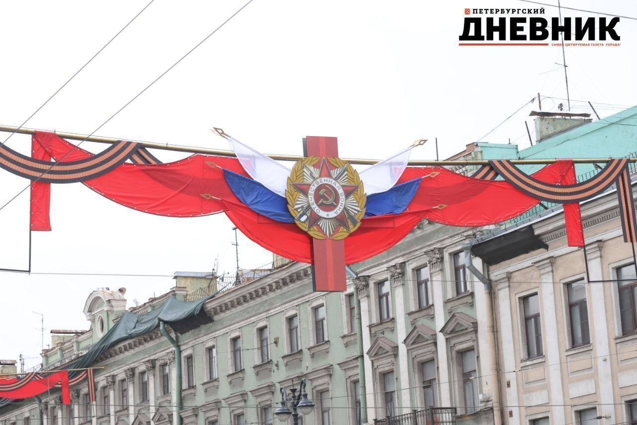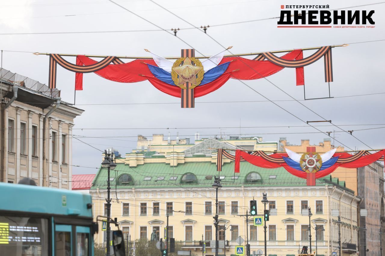 Невский проспект в Петербурге начали украшать ко Дню Победы 9 Мая: над дорогой повесили праздничное убранство в виде флагов России с георгиевской лентой. Оформление в центре города запечатлел фотограф «Петербургского дневника».