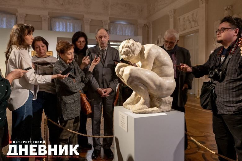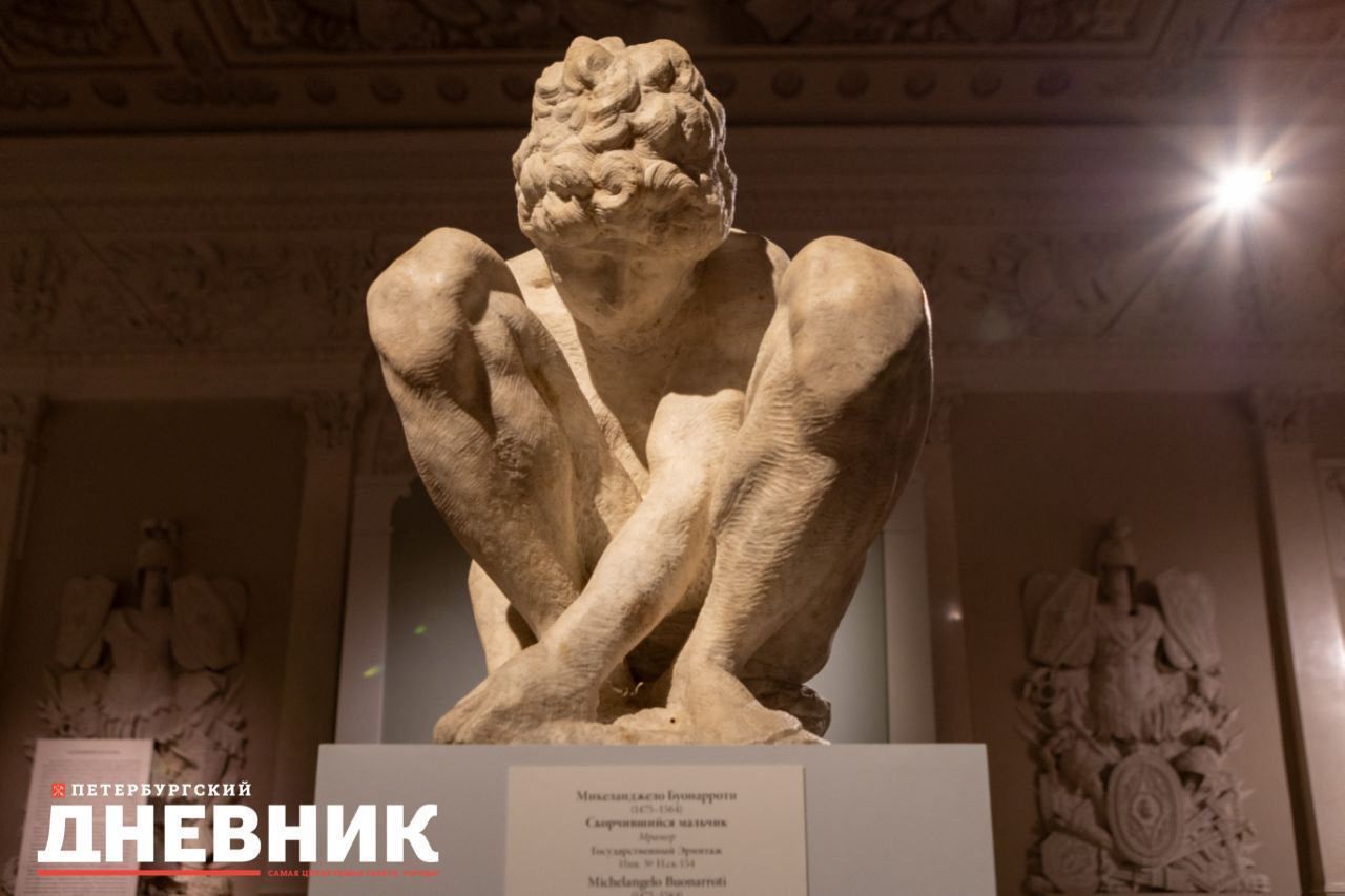 Центральным экспонатом выставки является скульптура «Скорчившийся мальчик» – уникальное произведение Микеланджело, единственное в России. Статуя поступила для императорской коллекции еще в 1784 году и осталась незавершенной, как и многие работы мастера. Она изображает юношу, полного физических сил, но сломленного духовно.