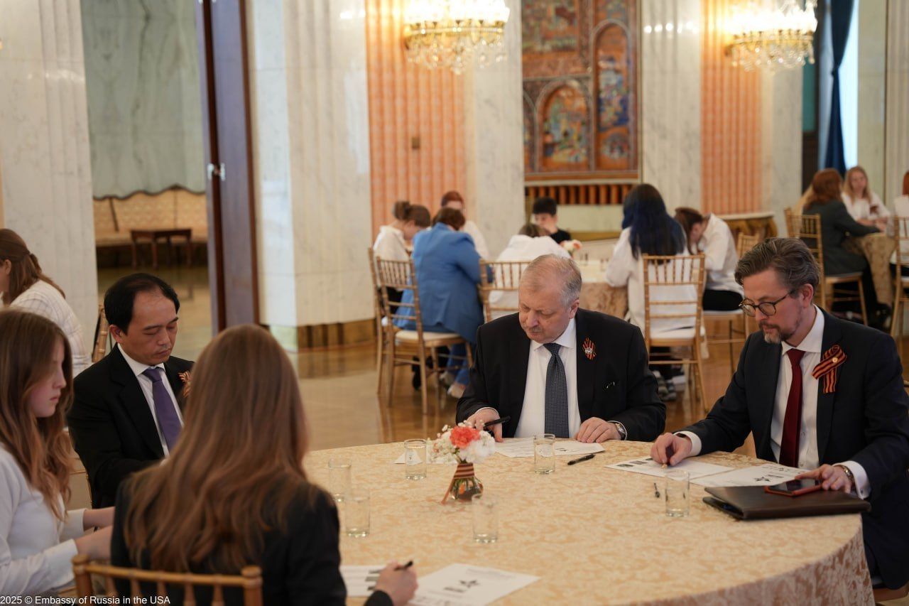 В посольстве России в США в рамках патриотической акции состоялся «Диктант Победы». В мероприятии приняли участие посол Александр Дарчиев, руководство диппредставительства, сотрудники и члены их семей, учащиеся посольской школы, а также соотечественники, подключившиеся в дистанционном формате.