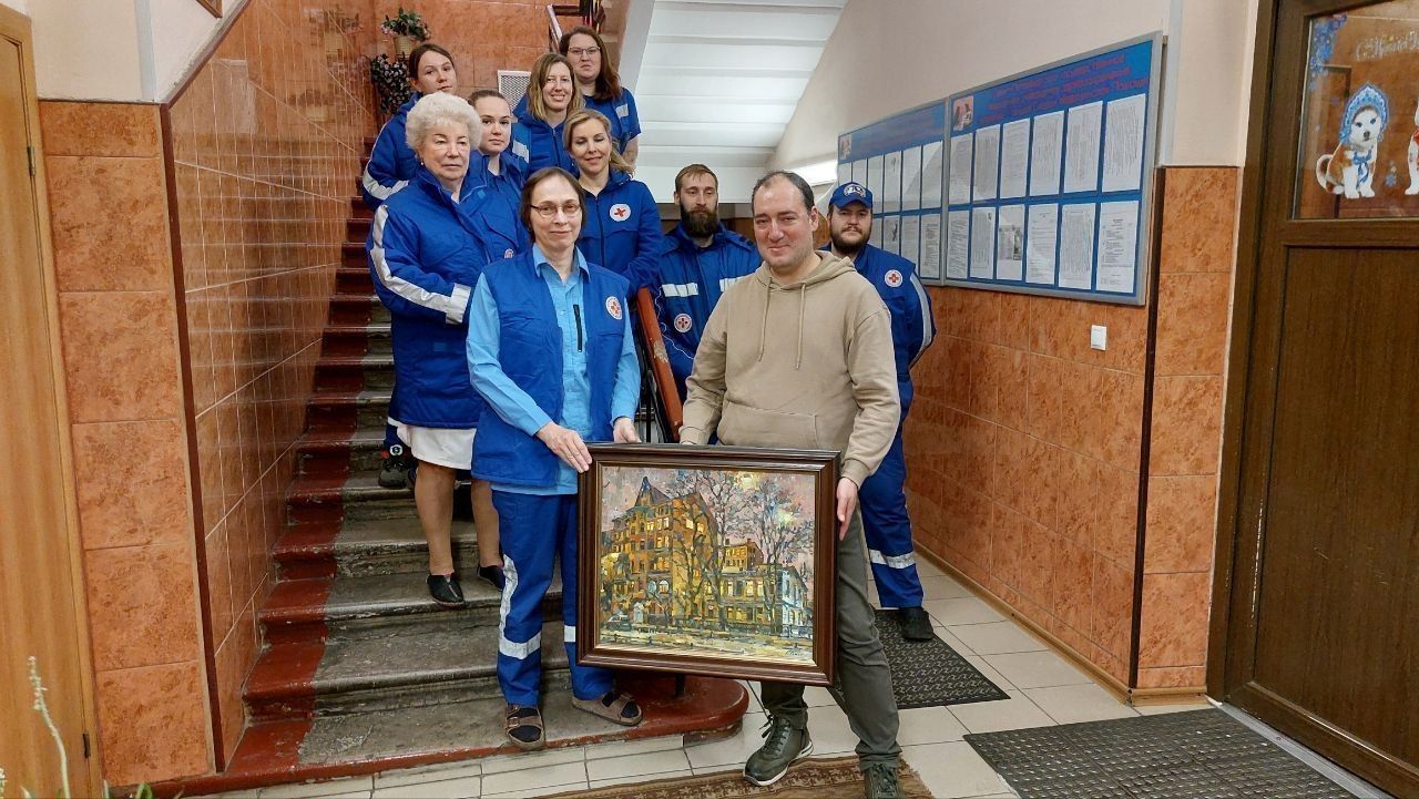 «Мы увидели фото этой картины в нашем чате и подумали: «Надо же, настоящий художник написал нашу станцию!» И кто-то сказал: «Нам бы такую картину». И мы с коллегой, фельдшером Светланой Бразговской, загорелись, начали искать автора и выяснили, что это известный петербургский художник Павел Еськов, а картина называется «Вечером на 12-й линии Васильевского острова». Позвонили ему, пригласили прийти на подстанцию. И Павел согласился», – рассказывает Резеда Ниязовна.