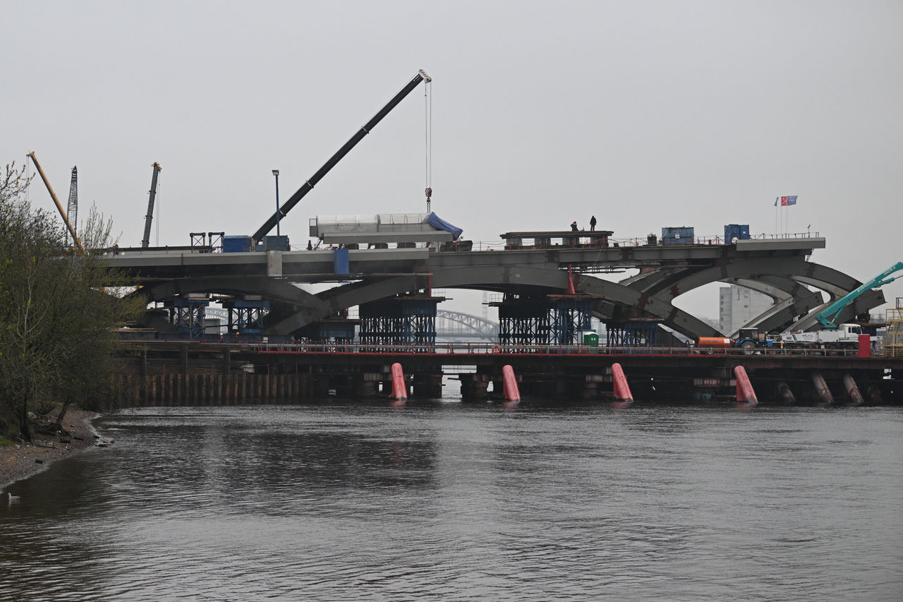 На левом берегу Невы сейчас продолжается укрупнительная сборка металлоконструкций разводного пролёта моста на стапеле, расположенном на Перевозной набережной.