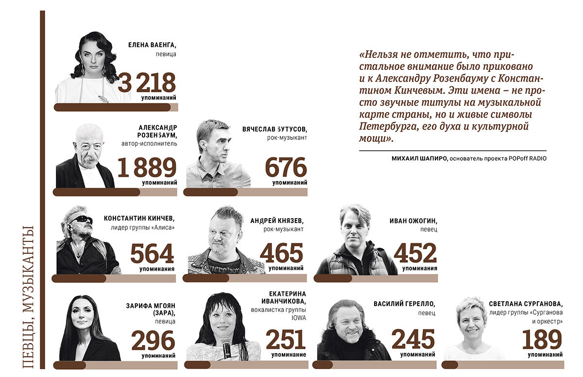 «Говоря о героях первого квартала 2025 года на страницах СМИ, нельзя не отметить, насколько закономерно, что столь пристальное внимание было приковано именно к Константину Кинчеву и Александру Розенбауму. Оба этих имени – не просто звучные титулы на музыкальной карте страны, но живые символы Петербурга, его духа и культурной мощи», – сказал петербургский музыкант, основатель групп «Чемпионы» и POPoff RADIO Михаил Шапиро.