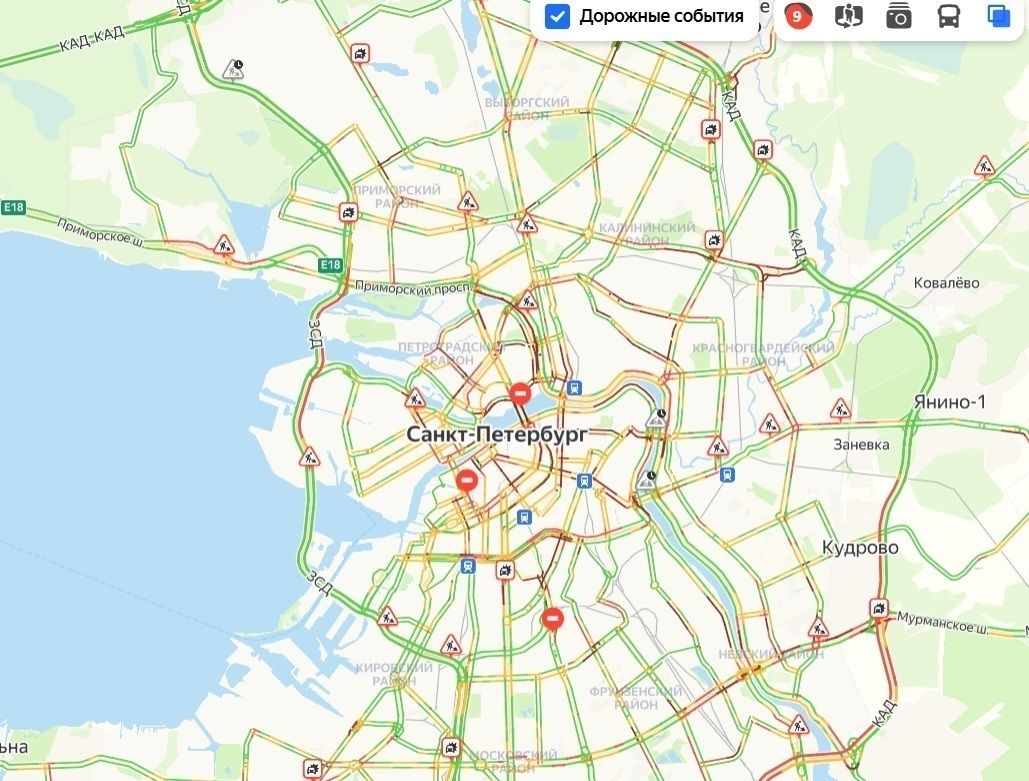 Пробки также есть на улицах Белинского, Литейном проспекте, Пестеля, Малой Морской, в Кирпичном переулке, на Гражданской, Садовой, набережной канала Грибоедова и улице Некрасова. Ожидается, что высокая загруженность дорог сохранится еще как минимум два часа. По прогнозам сервиса «Яндекс.Пробки», заторов станет меньше около 19 часов, а в 21 час дороги города будут практически пустыми.
