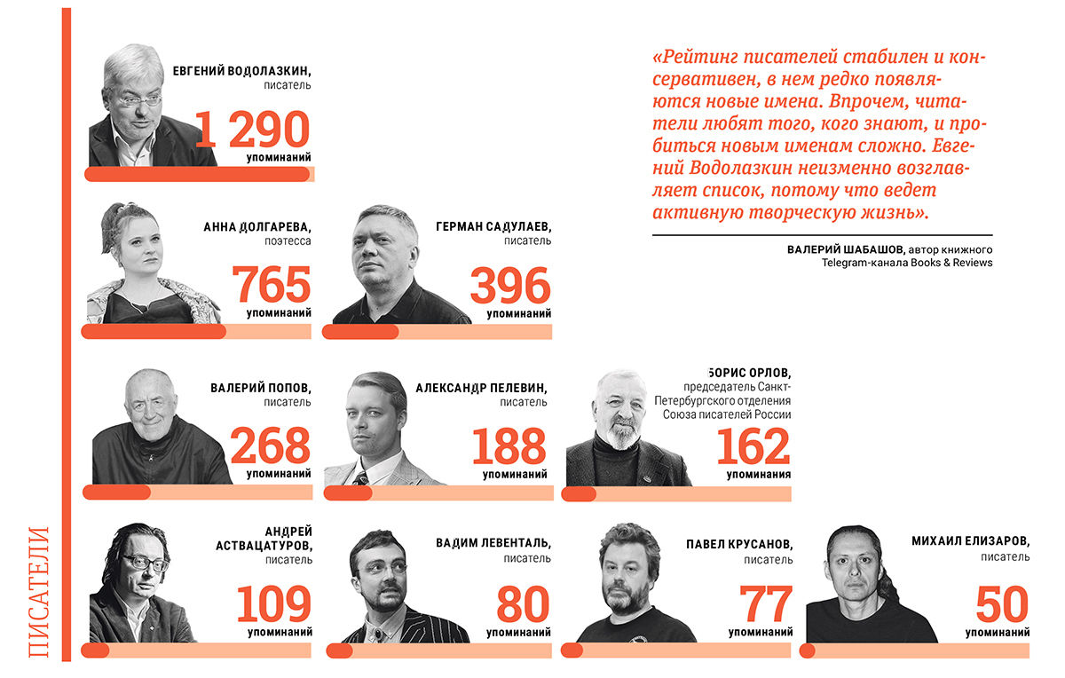 «Рейтинг писателей стабилен и консервативен, в нем редко появляются новые имена. Впрочем, читатели любят того, кого знают, и пробиться новым именам сложно. Евгений Водолазкин неизменно возглавляет список, потому что ведет активную творческую жизнь», – отметил автор книжного телеграм-канала Books & Reviews Валерий Шабашов.