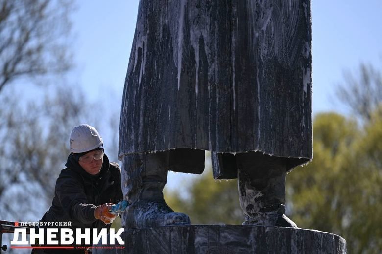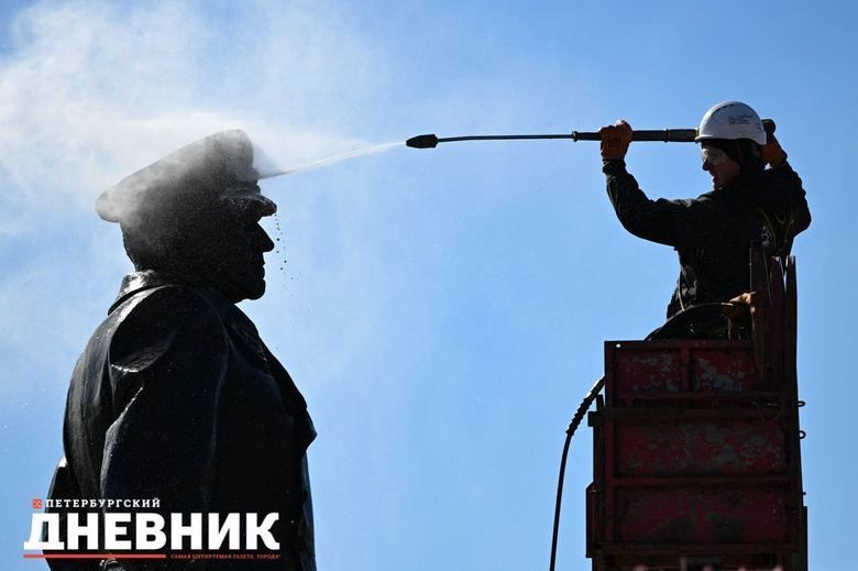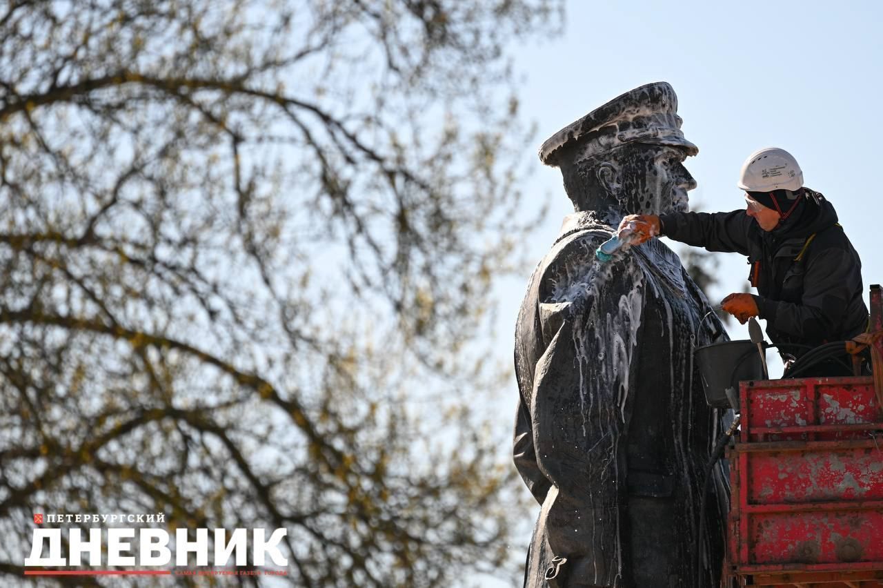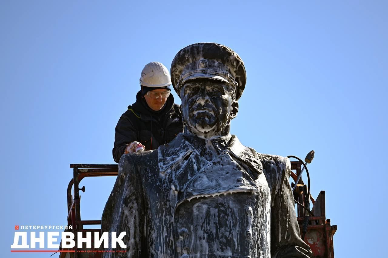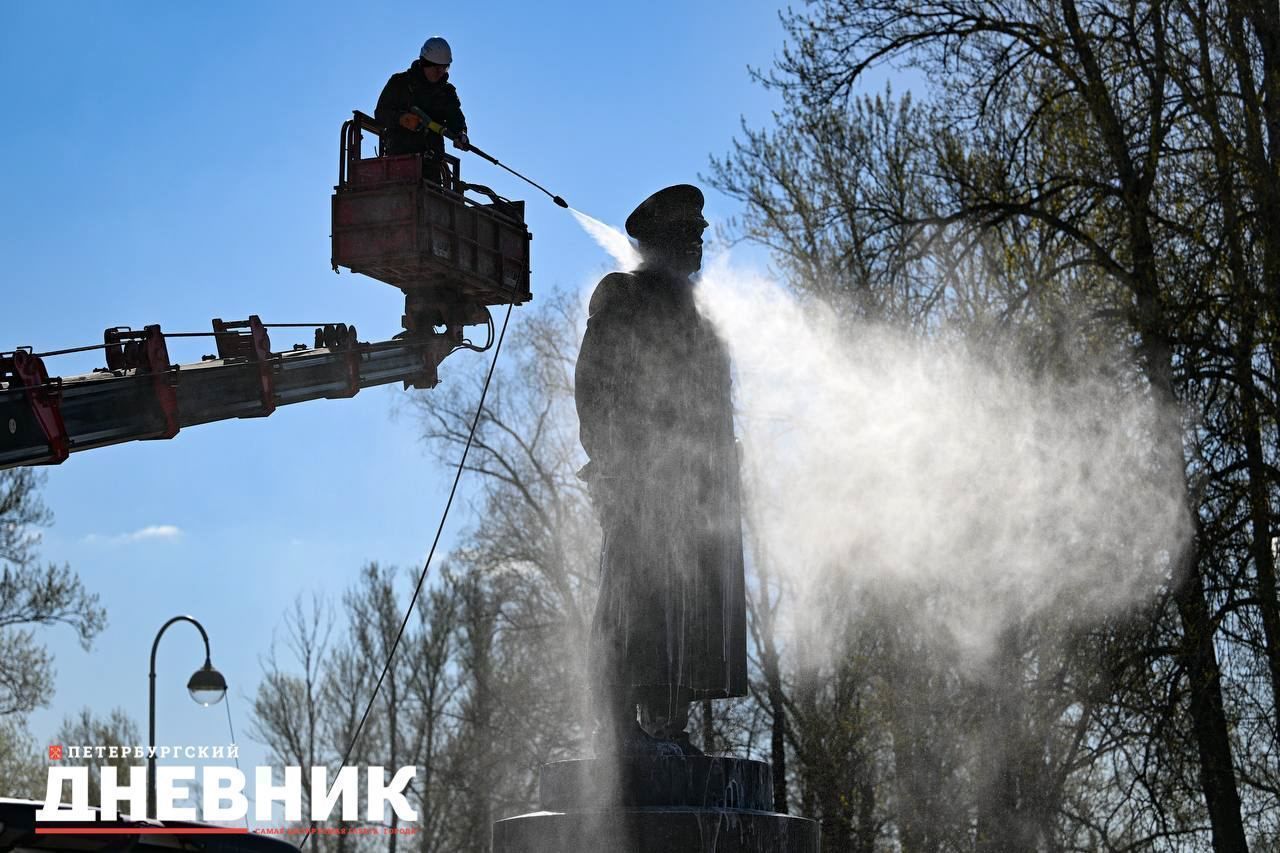 В Московском парке Победы помыли памятник Георгию Жукову. «Петербургский дневник» публикует фотографии, на которых запечатлели процедуру подготовки монумента к празднованию Дня Победы.
