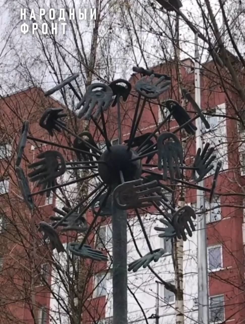 Двухметровый арт-объект выполнен в виде раскрытых ладоней. Его установили во дворе лицея №64 на Богатырском проспекте.
