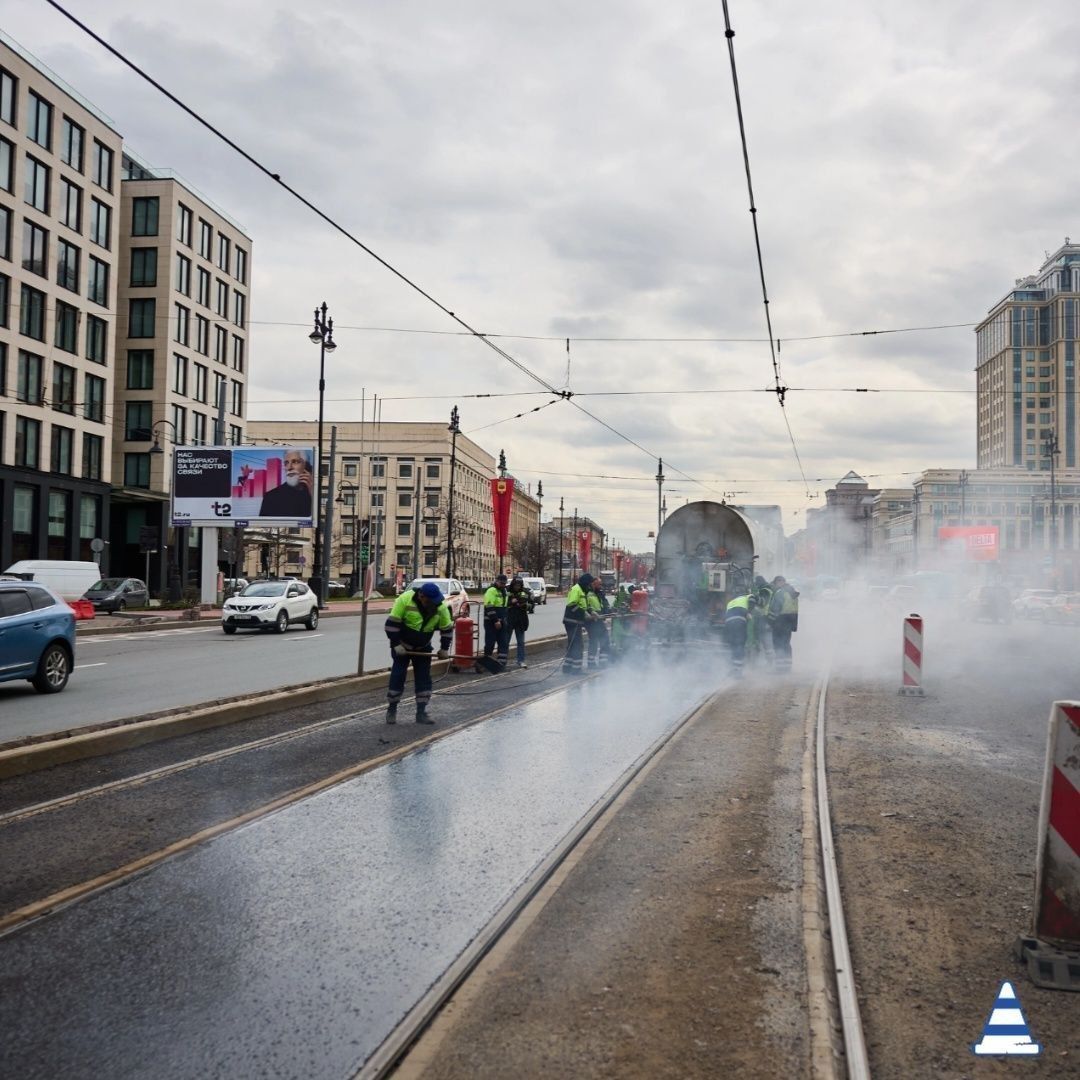 На Московском проспекте в зоне трамвайных путей ведется укладка литого асфальта. Такой асфальт в процессе остывания самостоятельно набирает прочность и превращается в твердое и ровное покрытие. Об этом пишет официальный телеграм-канал Комитета по развитию транспортной инфраструктуры Санкт-Петербурга.