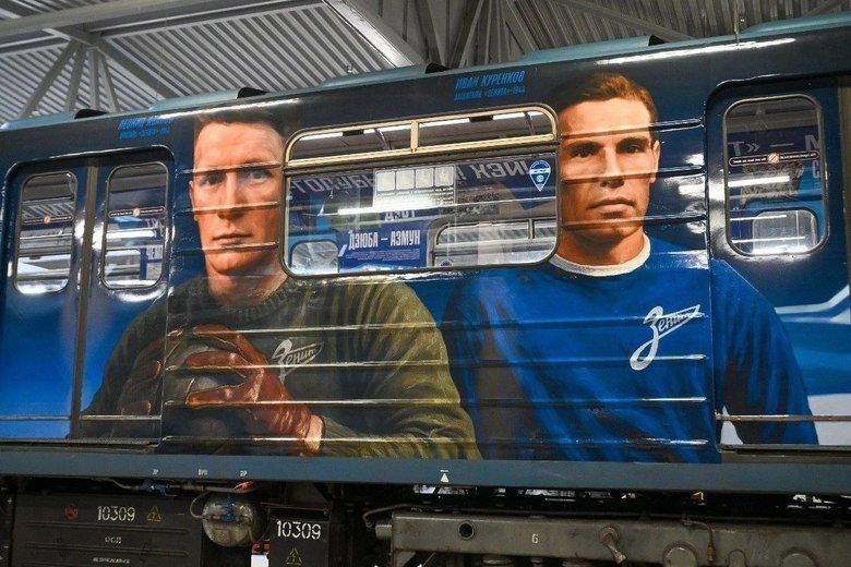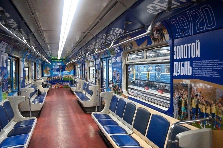 Сине-бело-голубые отметят юбилей 25 мая. Пассажиры метро могут погрузиться в вековую историю «Зенита» уже сейчас – на линию синей ветки вышел брендированный поезд.