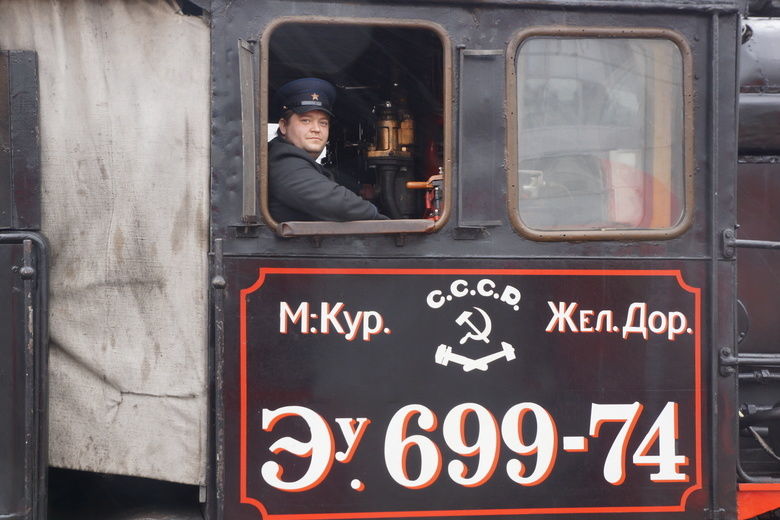 Затем началось театрализованное представление, во время которого к перрону прибыли уникальные ретролокомотивы периода Великой Отечественной войны. Первым появился паровоз серии «Ов», легендарная «Овечка». Построенная ещё начале прошлого века, она выглядит очень бодрой.