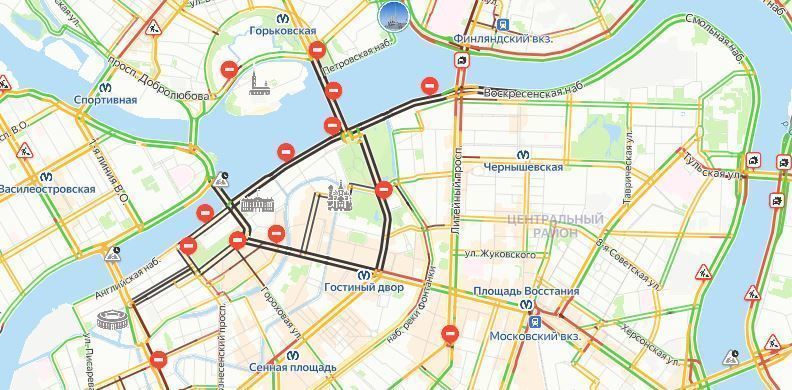 Движение в районе Дворцовой площади перекрыли с 6:00 утра, полностью закрыты участки Невского проспекта и Садовой улицы, Дворцовой набережной. Пробка собралась у площади Восстания и на набережных в центре.
