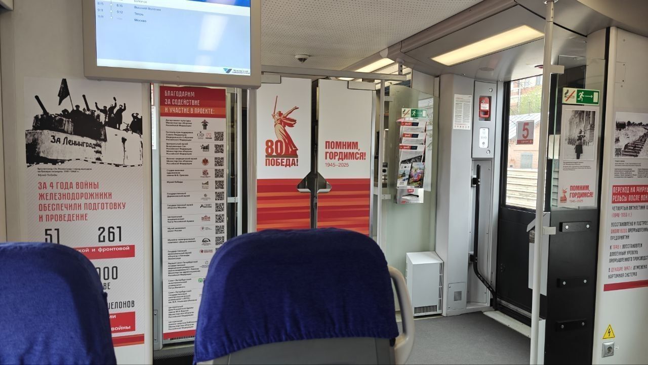 Добавим, что особое внимание при оформлении поезда было уделено подвигу железнодорожников и их вкладу в Победу.