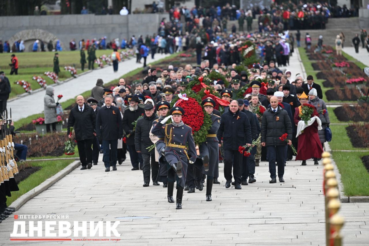 Цветы и венки к монументу «Мать-Родина» возложили руководители органов власти: полпред президента в СЗФО Александр Гуцан, губернатор Александр Беглов и члены городского правительства, председатель Законодательного собрания Петербурга Александр Бельский, представители ветеранских сообществ, митрополит Санкт-Петербургский и Ладожский Варсонофий и другие.