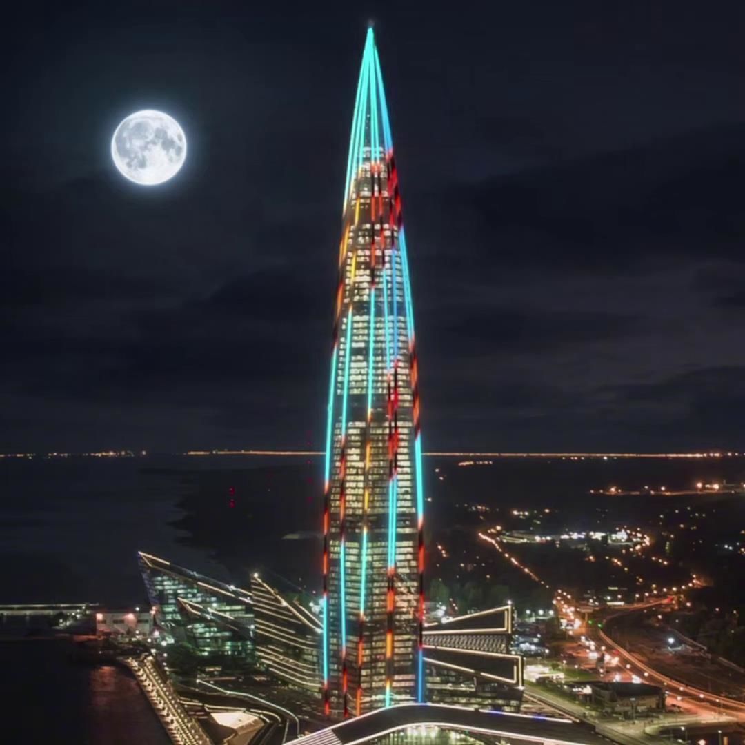На здании «Лахта Центра» сегодня вечером включили праздничную подсветку в честь Дня Победы.