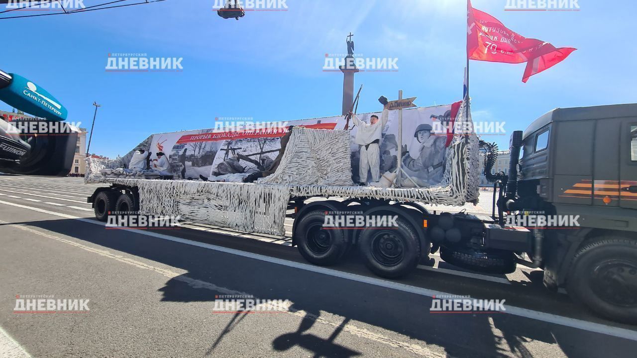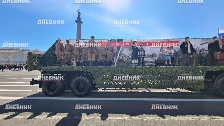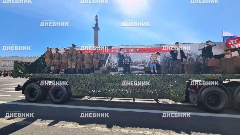Также по Дворцовой площади проехала передвижная выставка-реконструкция, посвященная жизни Ленинграда до и вовремя блокады, боевым действиям на Ленинградском фронте, освобождению и восстановлению города, а также специальной военной операции.
