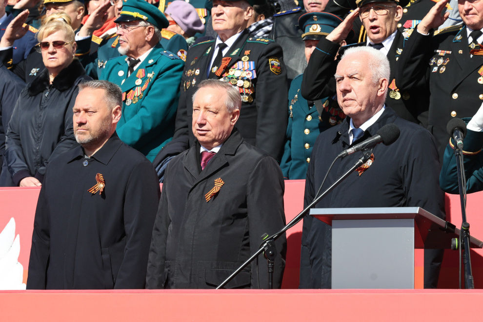 С трибун участников парада приветствовали губернатор Александр Беглов, полномочный представитель Президента России в СЗФО Александр Гуцан, председатель Законодательного собрания Санкт-Петербурга Александр Бельский, члены правительства и депутаты парламента города, руководители федеральных органов власти в Санкт-Петербурге, силовых ведомств и структур, главы конфессий, ветераны Великой Отечественной войны, блокадники, в том числе прибывшие на праздник из-за рубежа, участники специальной военной операции, школьники из Курской области, Донецкой и Луганской Народных Республик.