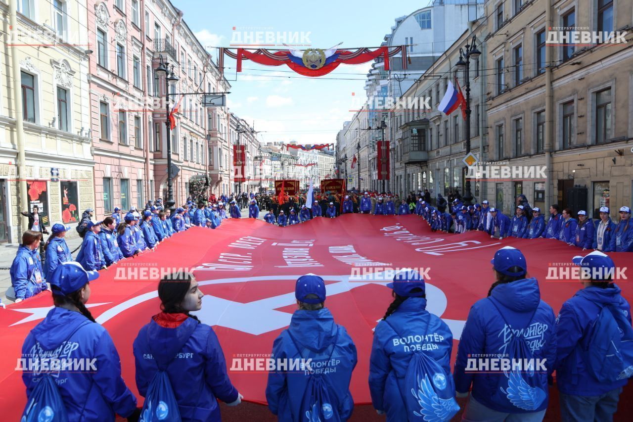 Также прямо сейчас в центре Петербурга волонтёры Победы торжественно развернули Знамя Победы – один из главных символов великого подвига нашего народа.