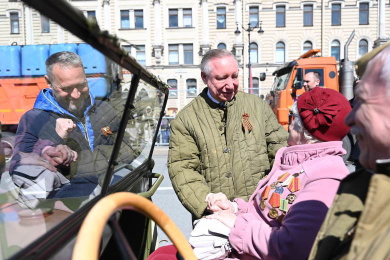 Перед началом шествия Александр Беглов приветствовал ветеранов, блокадников и участников СВО, которые на ретроавтомобилях возглавили колонну «Бессмертного полка».