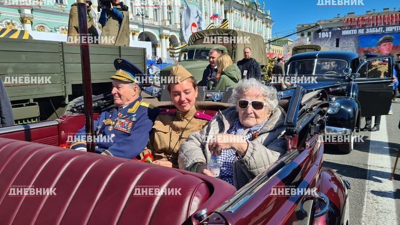 Ветераны ВОВ и СВО проезжают по Невскому проспекту на ретротехнике в парадной колонне