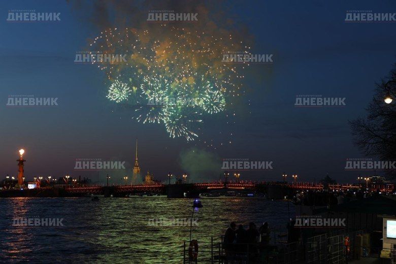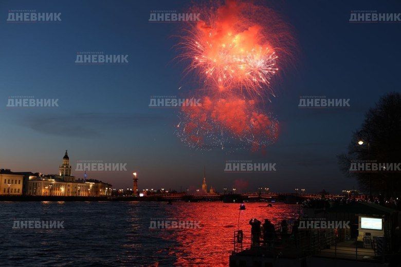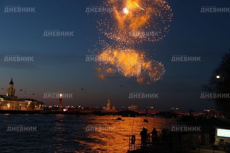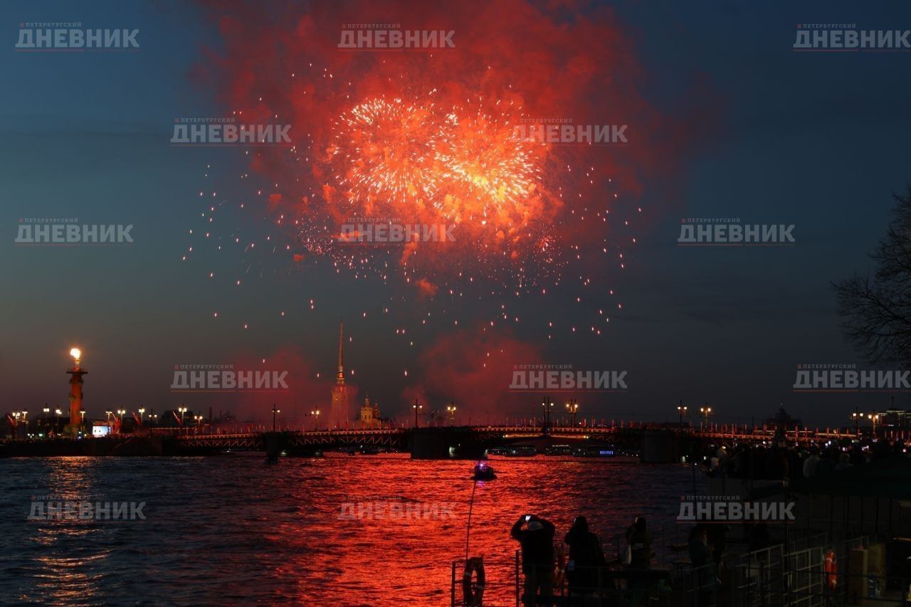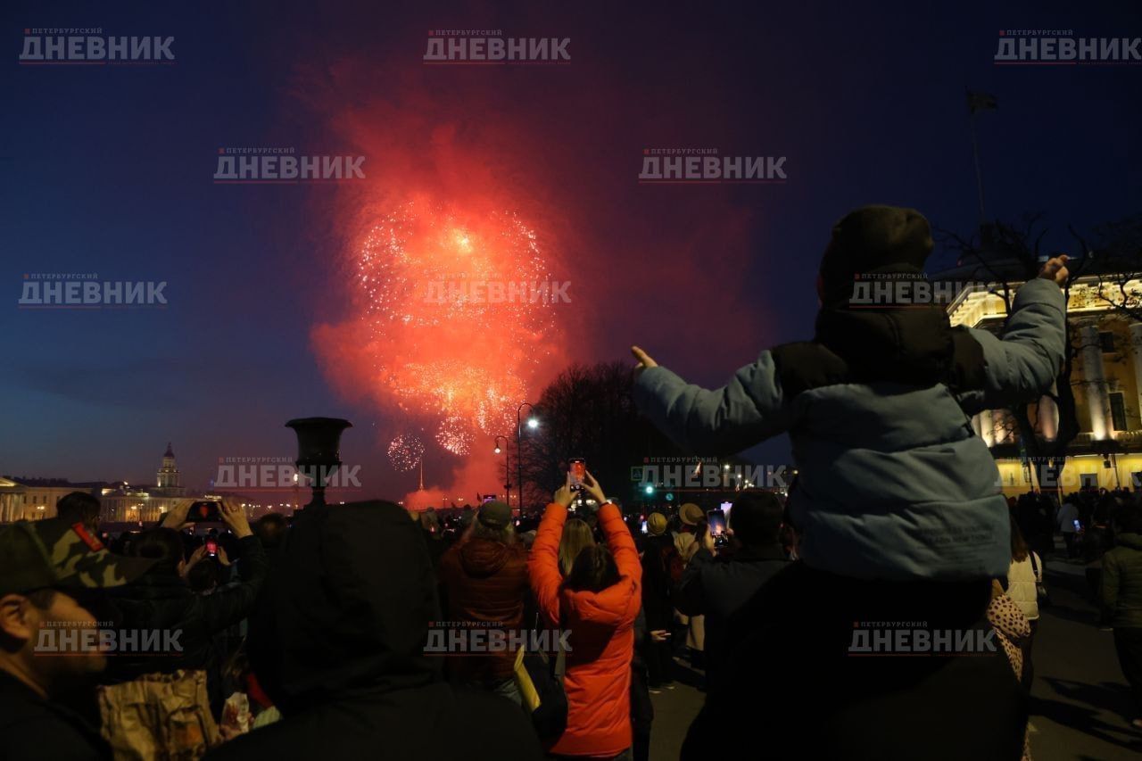 Губернатор нашего города Александр Беглов, главком ВМФ РФ Александр Моисеев, спикер Заксобрания Александр Бельский и другие официальные лица поздравили расчеты Михайловской военной артиллерийской академии, ответственные за праздничный салют у Петропавловской крепости. С Большого пляжа было произведено 30 залпов, сопровождаемых фейерверком. Две салютные батареи из двенадцати 85-мм орудий Д-44 и десяти установок 2А85 расцветили небо над Невой.