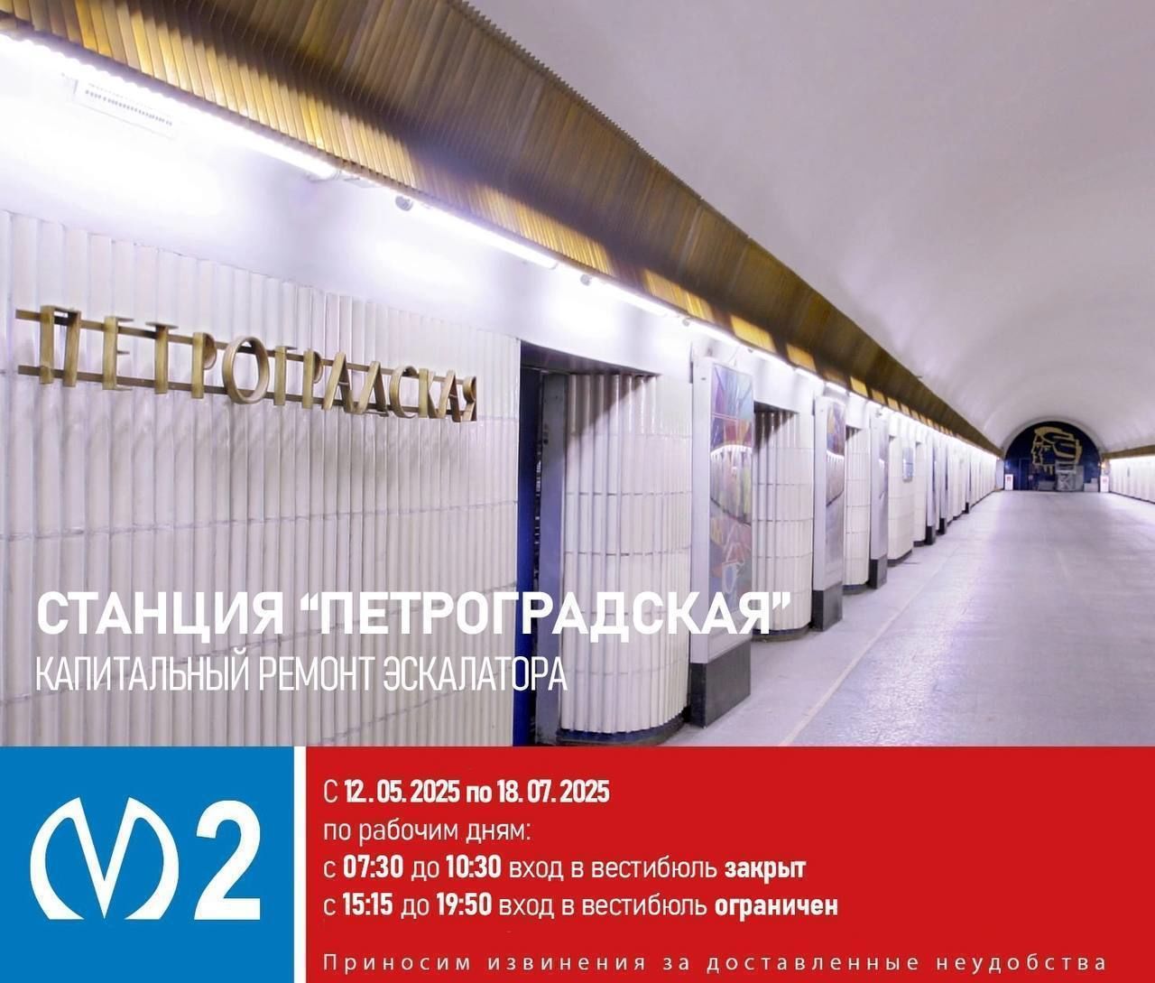 Вестибюль станции метро «Петроградская» будет временно закрываться на вход с 12 мая по 18 июля по рабочим дням.