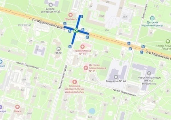 На перекрёстке 2-го Муринского проспекта и Институтского проспекта в Петербурге с 12 мая по 7 июня ограничено движение транспорта.