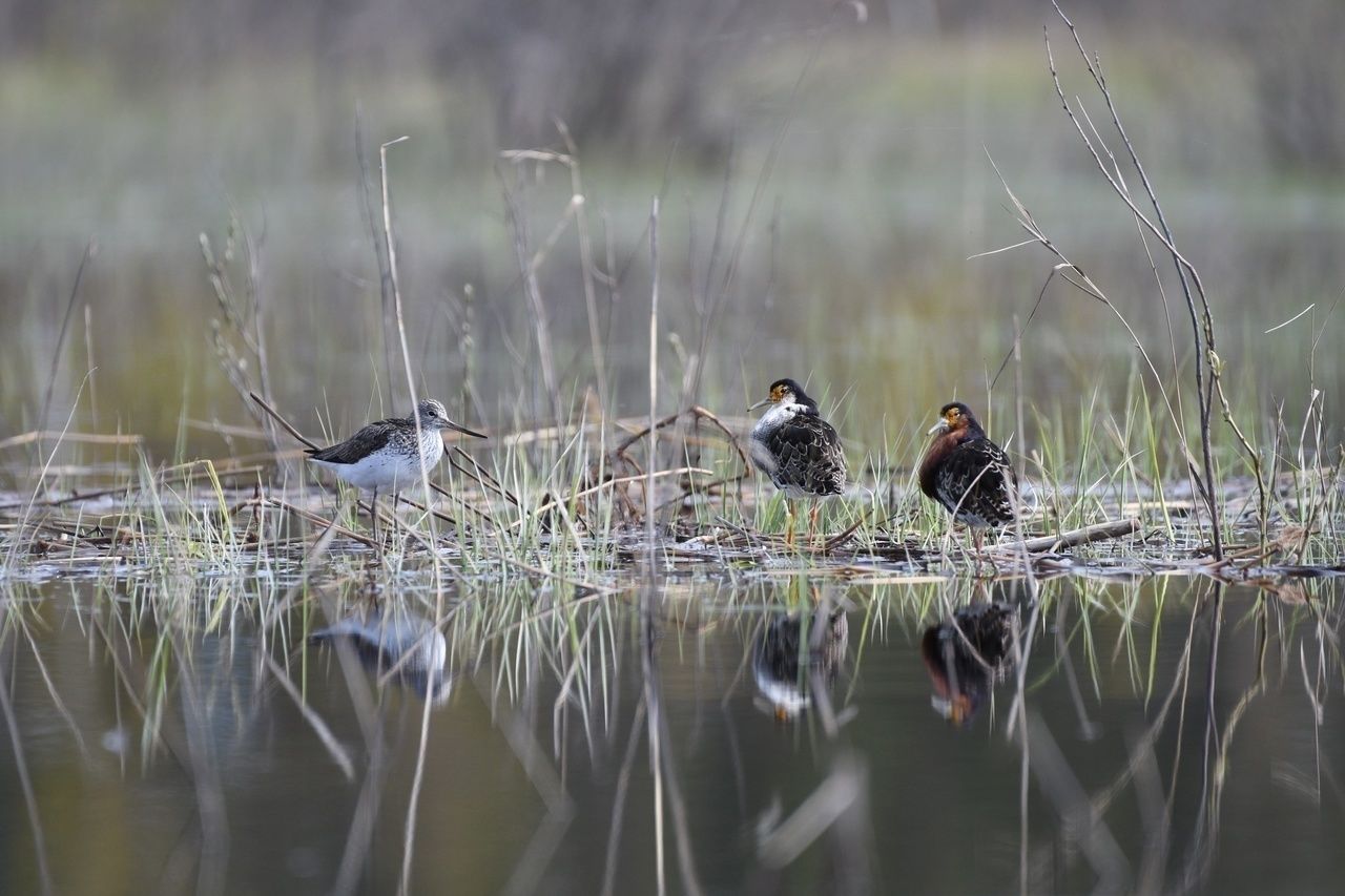 Фотографии куликов опубликовал Нижне-Свирский заповедник. На снимках – большой улит и два самца турухтанов.