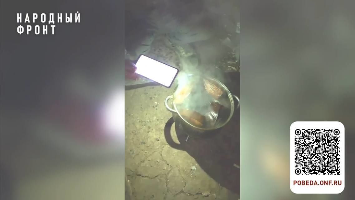 На кадрах видно горячую кастрюлю. В ней – копченое сало. Для освещения «кухни» бойцы используют телефонные фонарики.