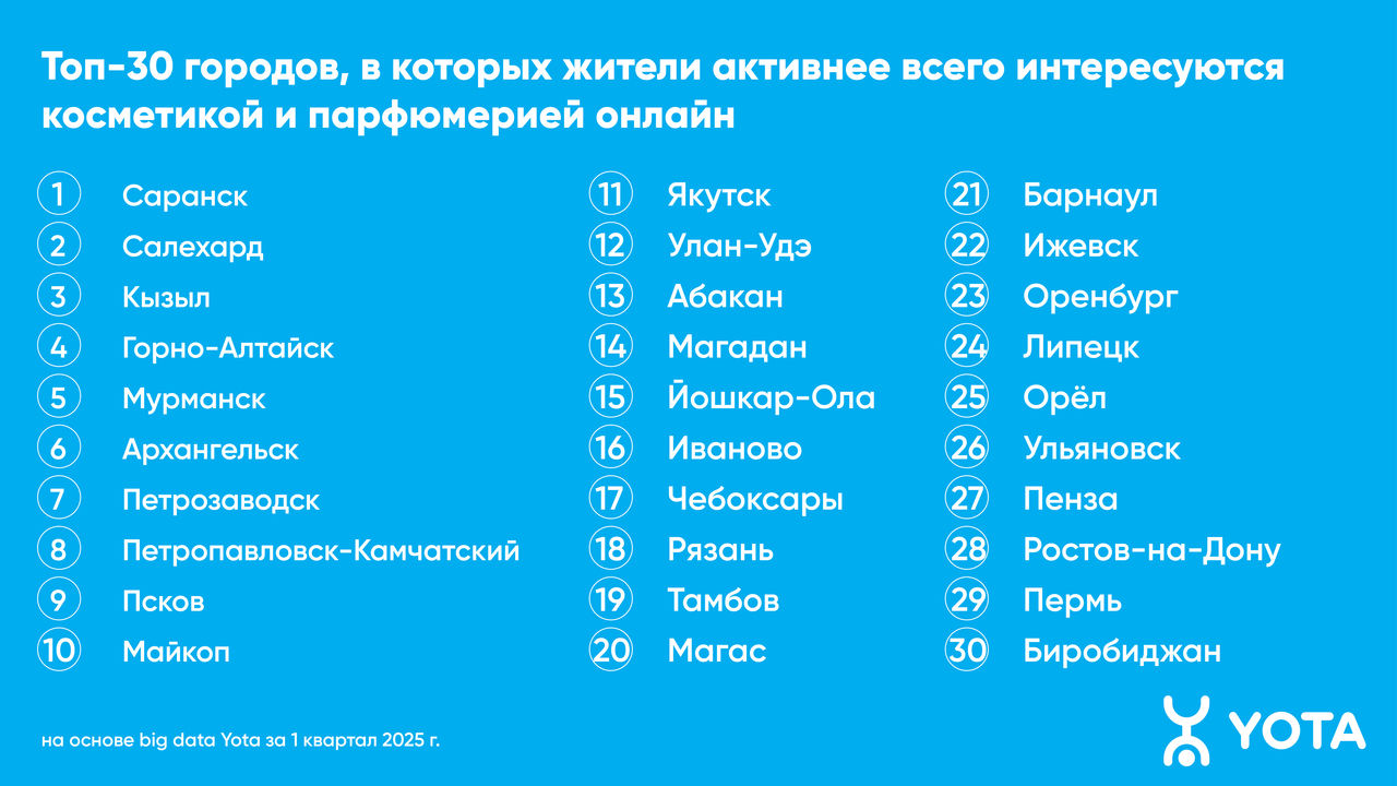 Жители Саранска, Салехарда и Кызыла чаще остальных интересуются онлайн-покупками косметики и парфюмерии. В топ-10 также вошли Горно-Алтайск, Мурманск, Архангельск, Петрозаводск, Петропавловск-Камчатский, Псков и Майкоп – на жителей этих городов, где мало или вовсе нет офлайн-точек крупных косметических сетей, приходится больше всего интернет-трафика в расчете на одного пользователя.