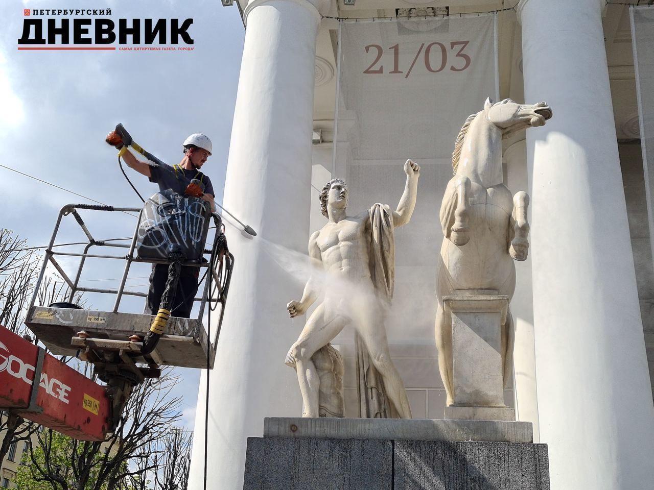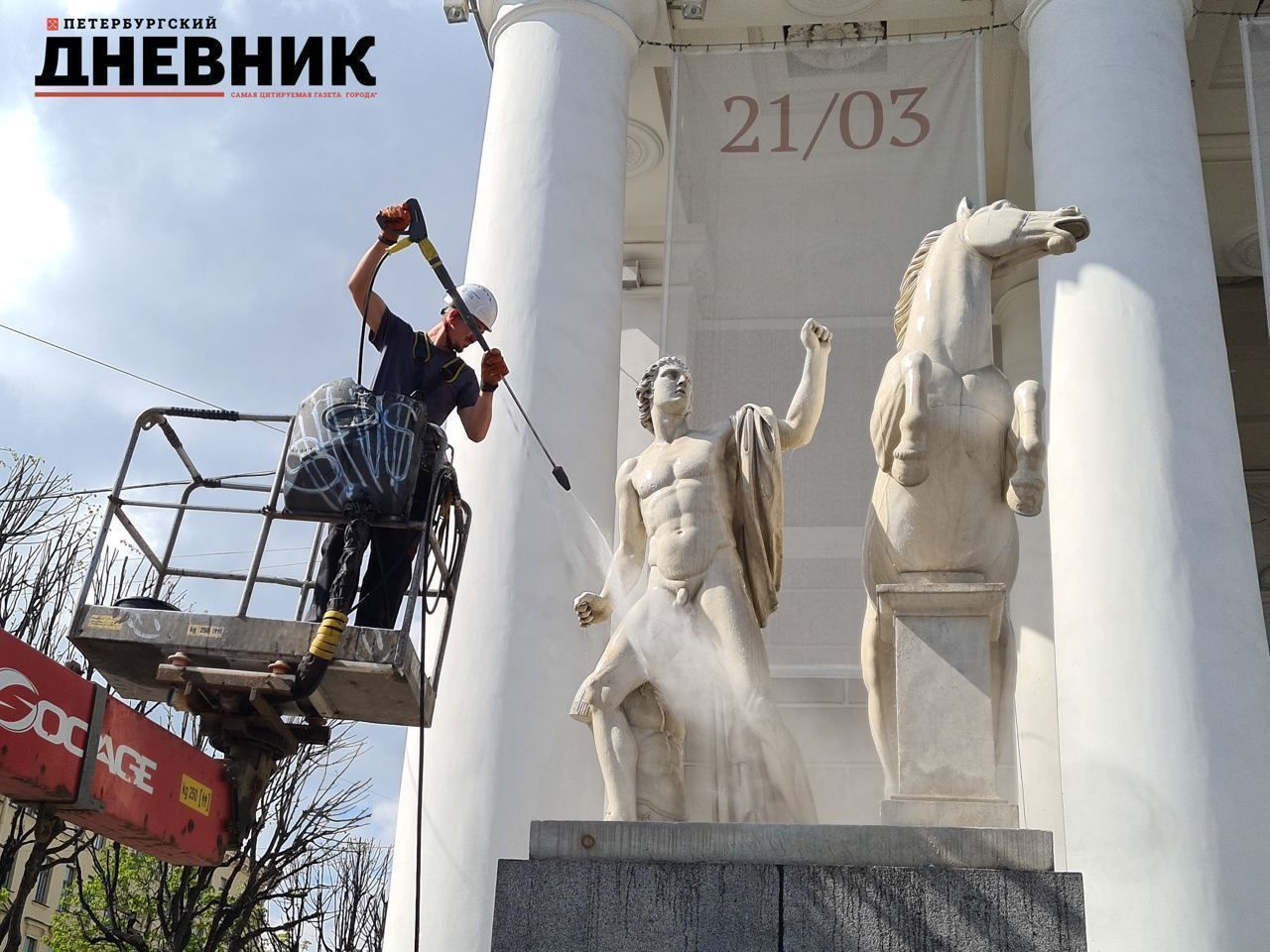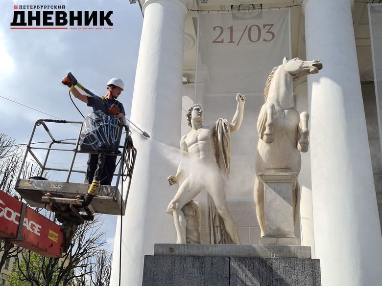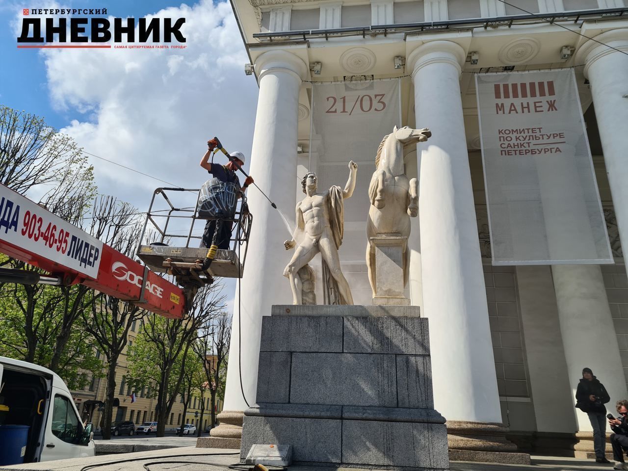 В Петербурге идёт помывка скульптурных групп «Диоскуры, укрощающие коней» напротив Конногвардейского манежа на Исаакиевской площади. «Весеннюю очистку» запечатлел фотограф «Петербургского дневника».