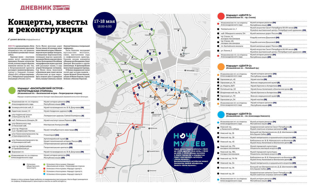 Метро в «Ночь музеев» будет работать по ежедневному расписанию. Мосты будут разводиться по графику. Информация о транспорте и мостах на сайте.