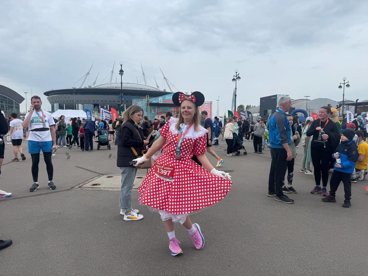Одной из самых ярких участниц стала девушка, пробежавшая 10-километровую дистанцию в костюме Минни-Маус, сшитом специально для этого события.