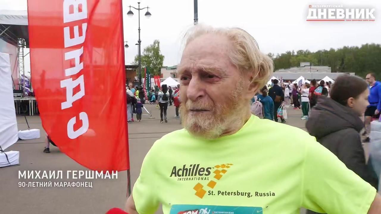 90-летний марафонец Михаил Гершман принял сегодня участие в забеге «Бегом с Дневником», который прошёл в Приморском парке Победы Петербурга.