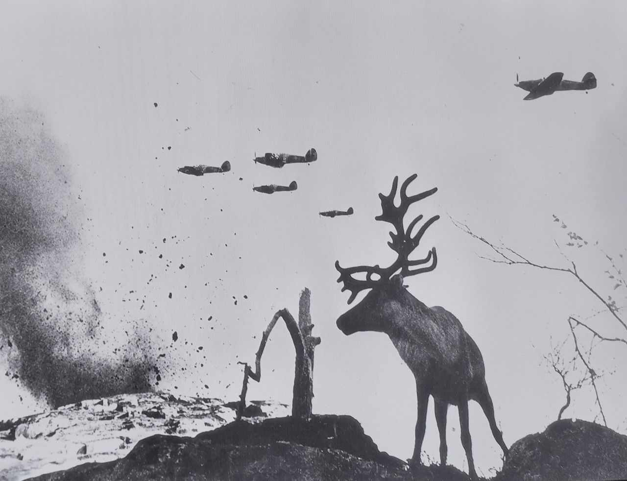 Еще одна известная фотография Халдея – мурманский олень Яша. Фотограф снял его в нескольких ракурсах, потом наложил на кадр изображения летящих истребителей. Получилось трогательное антивоенное фото, напоминающее о героической обороне Мурманска, северных железнодорожных путей, никелевых рудников. А про Яшу известно, что он, выйдя из леса к бойцам Советской армии, прожил с ними три года. Только когда армия пошла в наступление, Яшу решили отвезти в тундру. Олень очень не хотел расставаться, бежал за грузовиком.