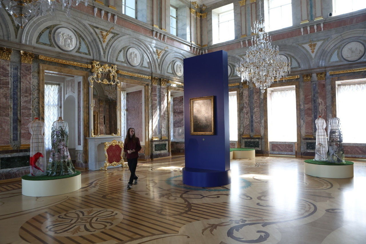 Собаки, точнее их скульптурные изображения, встречают посетителей уже во дворе Мраморного дворца. Дальше – больше. Представленные в произведениях живописи, графики, скульптуры, декоративно-прикладного искусства, нумизматики, они занимают оба этажа музея. Ради них впервые открыли даже Зимний сад.