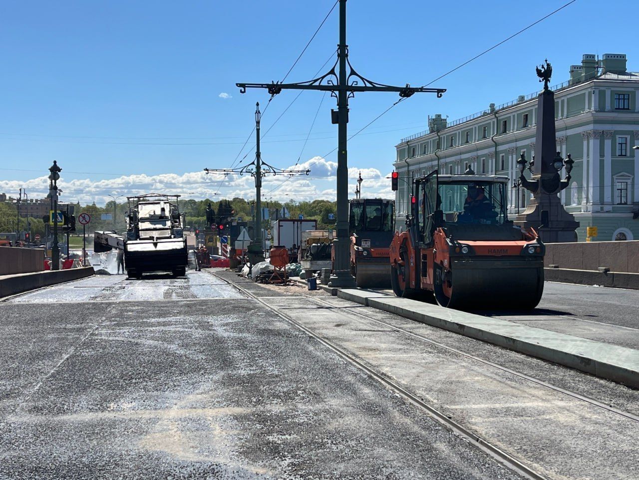На Троицком мосту приступили к укладке второго, последнего слоя асфальта. Это значит, что ремонтные работы скоро подойдут к концу. Официальная дата сдачи – 10 июня.