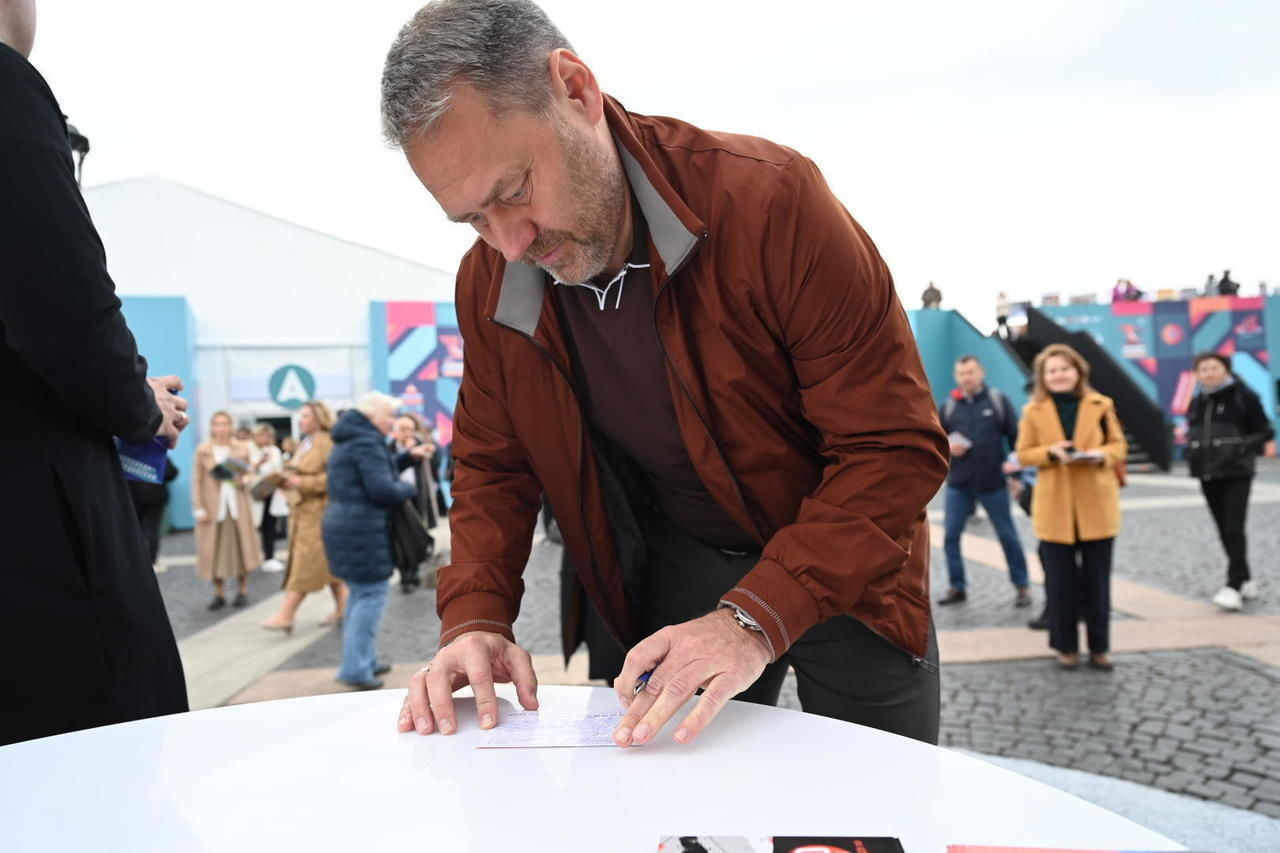 Председатель Законодательного собрания Санкт-Петербурга Александр Бельский открыл «Литературную почту», которая работает на Дворцовой площади в рамках Книжного салона. Он отправил открытку ветерану Клавдии Смирновой, с которой познакомился на ретропараде в День Победы.