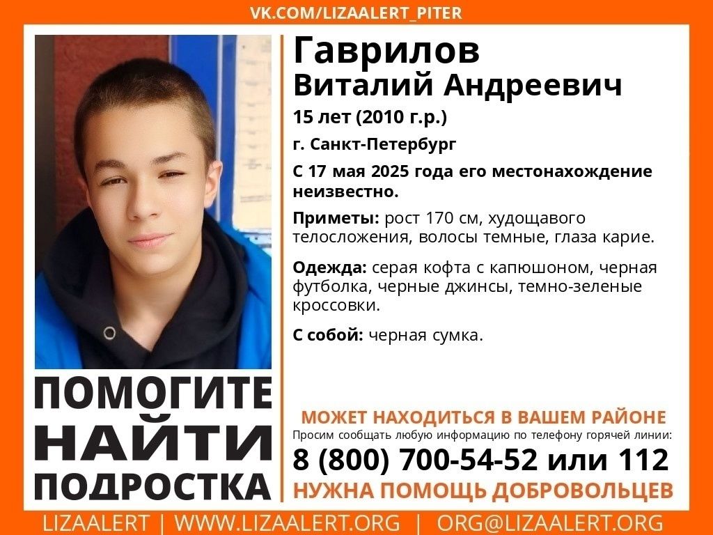 В Санкт-Петербурге пропал подросток 15 лет Гаврилов Виталий Андреевич. С 17 мая его местонахождение неизвестно, об этом сообщает поисковый отряд «ЛизаАлерт» в своем сообществе во «ВКонтакте».