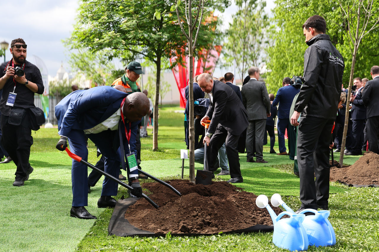 Александр Беглов вместе с председателем Национального собрания Центральноафриканской Республики Симплисом Матьё Саранджи посадили саженец рябины.